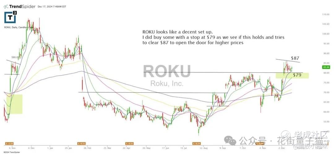 ROKU 看起来是一个不错的设置。我确实在 79 美元买入了一些,并设置了止损位,看看是否能够守住,并尝试突破 87 美元,打开更高价格的大门。