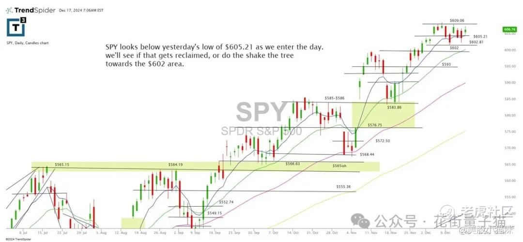 SPY 在开盘时低于昨日的 605.21 美元,我们将观察该位置是否被重新夺回,或者是否会回落至 602 美元区域。