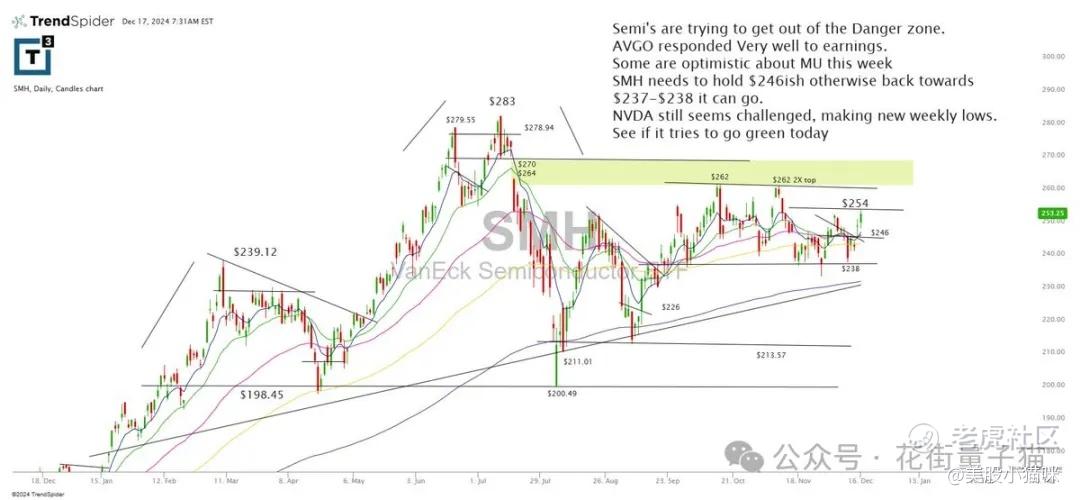 半导体板块正尝试摆脱“危险区域”,AVGO 财报表现非常出色。市场对 MU 本周表现持乐观态度。SMH 需要守住约 $246,否则可能回撤到 $237-$238 区域。NVDA 依然面临挑战,创出新的周低点。观察今天是否会尝试翻绿。