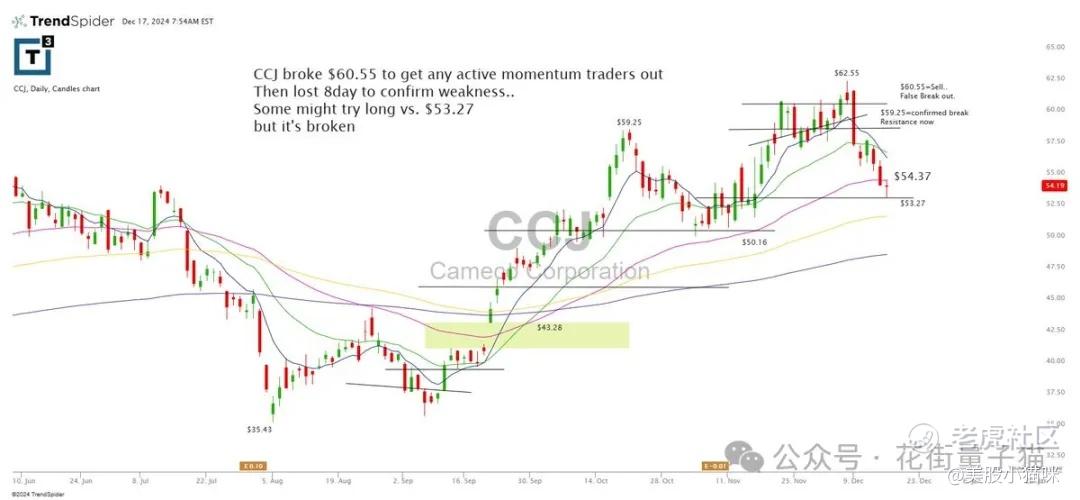 CCJ 跌破 60.55 美元,导致所有动能交易者出局。然后失守 8 天线,确认疲软。一些人可能会尝试以 53.27 美元作为支撑进行多头交易,但现在已经破位了。