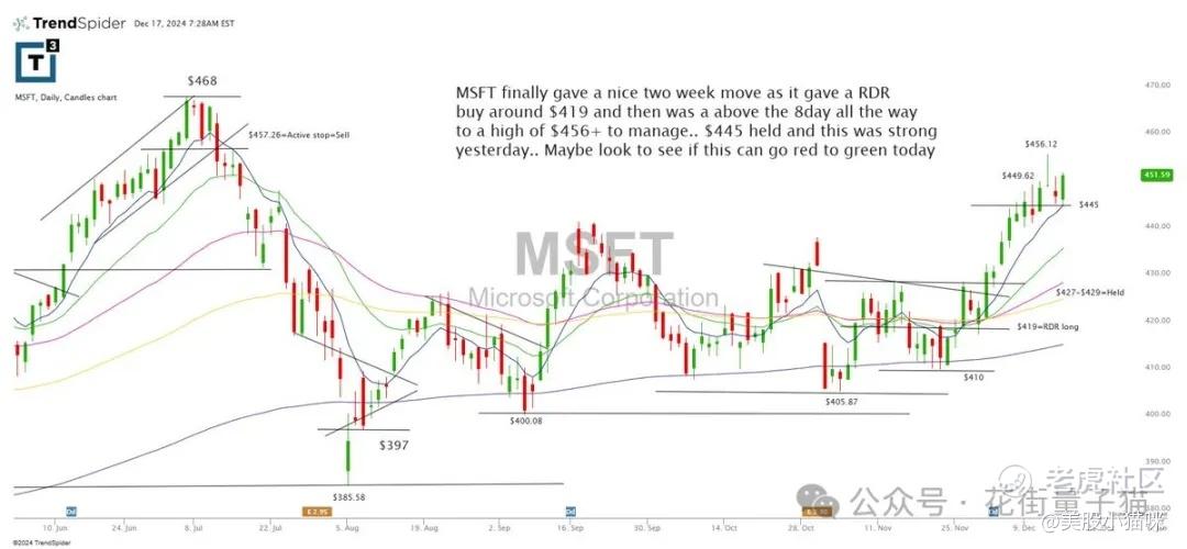 MSFT 过去两周表现强势,曾在 $419 附近形成 RDR 买入点,随后突破 8 日均线,一路上涨至 $456+ 高点。$445 位置成功守住,昨天表现也很强劲。今天可以关注是否会从红盘转为绿盘。