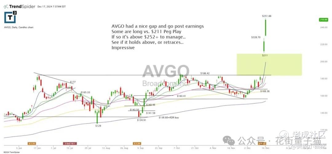 AVGO 在财报公布后跳空大涨,形成“跳空并走高”的走势。一些投资者选择在 $211 附近止损并做多。如果股价能够站稳 $252+,需要及时管理仓位。接下来观察股价是守住涨幅还是回撤,整体表现令人印象深刻。