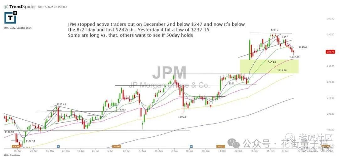 12 月 2 日,JPM 跌破 247 美元,现已跌破 8/21 天均线,失守 242 美元区域。昨日最低触及 237.15 美元。部分投资者选择在此价位做多,而其他人则在等待 50 天均线的支撑确认。