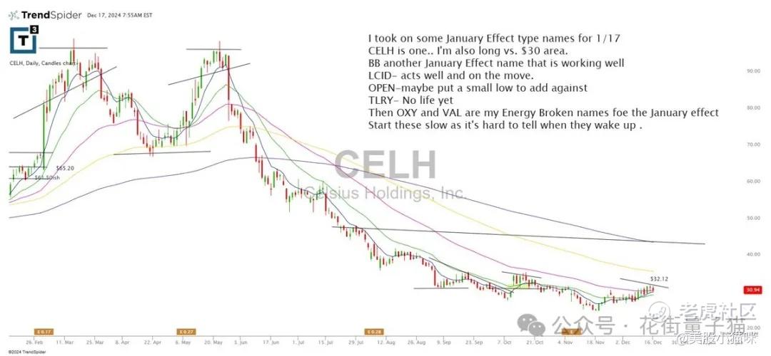 我选择了一些 1 月效应的股票,CELH 就是其中之一。我也在 30 美元附近做多。BB 是另一个表现良好的 1 月效应股票。LCID 表现不错并有上涨势头。OPEN——或许可以在低点小幅加仓。TLRY——目前还没有任何动静。OXY 和 VAL 是我为 1 月效应选的能源类破损股票。这些需要慢慢观察,很难预测它们何时启动。