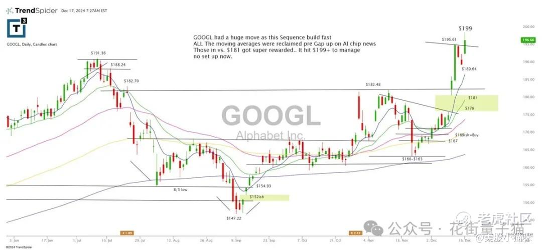 Alphabet 股价快速上涨,均线被 AI 芯片新闻提振后收复。早前在 181 美元区域入场的投资者获利丰厚,股价最高触及 199 美元,当前没有新的入场设置。