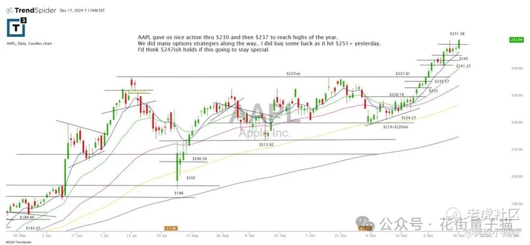 苹果股价突破 230 美元和 237 美元,创下年内高点。我们在此过程中执行了多种期权策略。昨日触及 251 美元以上,预计 247 美元区域的支撑将维持,确保涨势持续。