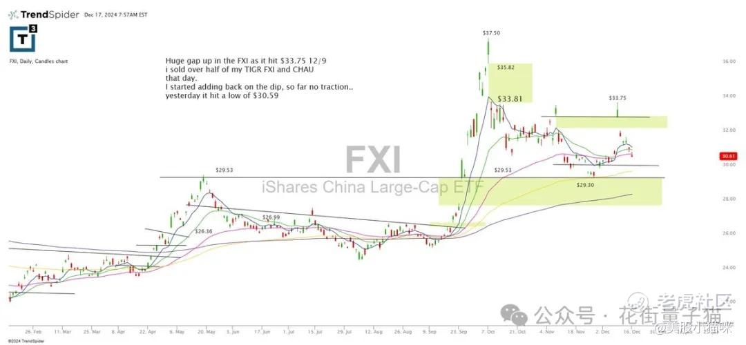 FXI 在 12 月 9 日大幅跳空上涨至 33.75 美元。我当天卖出了 TIGR、FXI 和 CHAU 的一半仓位。我开始在回调时逐步加仓,但目前没有取得进展。昨日低点触及 30.59 美元。