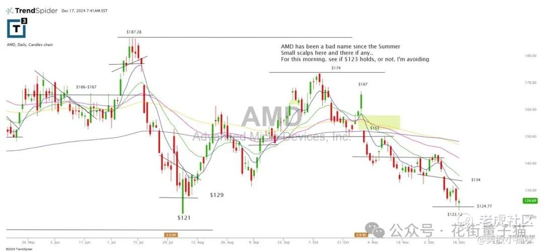 AMD 自夏季以来表现不佳,仅适合小波段操作。今天早盘需观察 $123 是否能守住,若无法守住,建议规避。