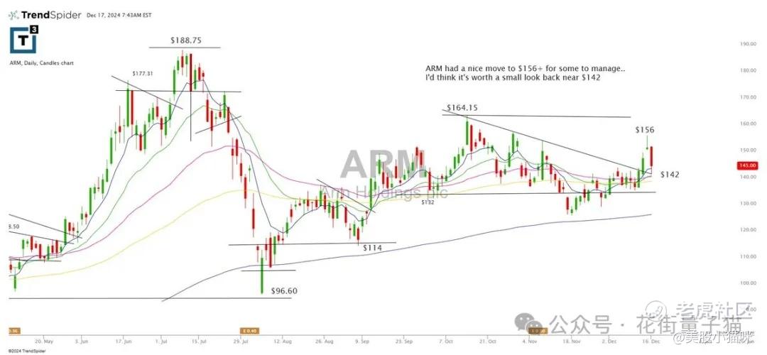 ARM 股价表现良好,最近涨至 $156+,适合投资者管理仓位。可以在 $142 附近回撤时小幅关注,寻找潜在的操作机会。