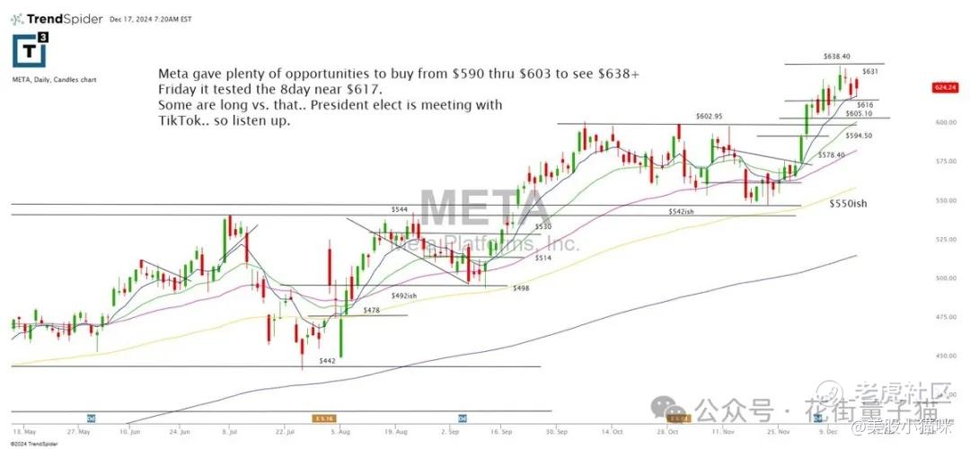 Meta 提供了从 590 美元到 603 美元的买入机会,最高涨至 638 美元以上。上周五,股价在 8 天均线附近测试 617 美元。部分投资者在此价位做多,市场也关注总统当选人与 TikTok 的会议,需保持关注。