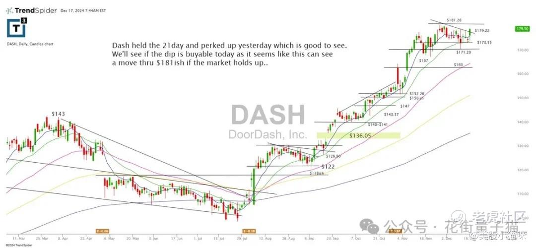 DASH 昨天守住了 21 日均线并反弹,整体表现良好。接下来需要观察今天的回调是否有买入机会。如果市场稳定,股价有望突破 $181。