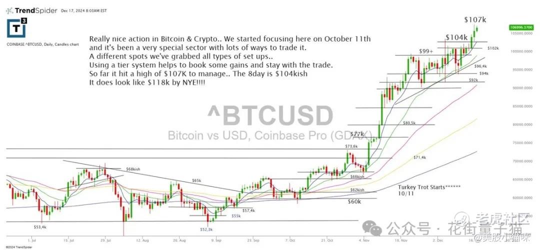比特币和加密货币表现非常好。我们从 10 月 11 日开始关注,这是一个特别的市场,有多种交易方法。通过分级系统,我们已经锁定了一些利润并保持持仓。目前价格触及 107K 美元,8 天线在 104K 附近。预计到新年,它可能达到 118K 美元!