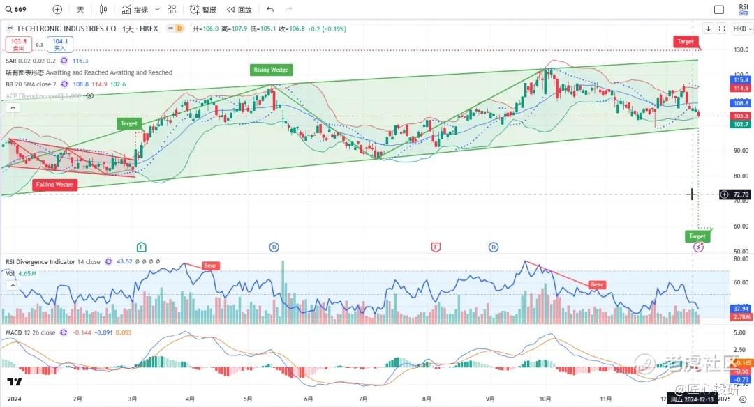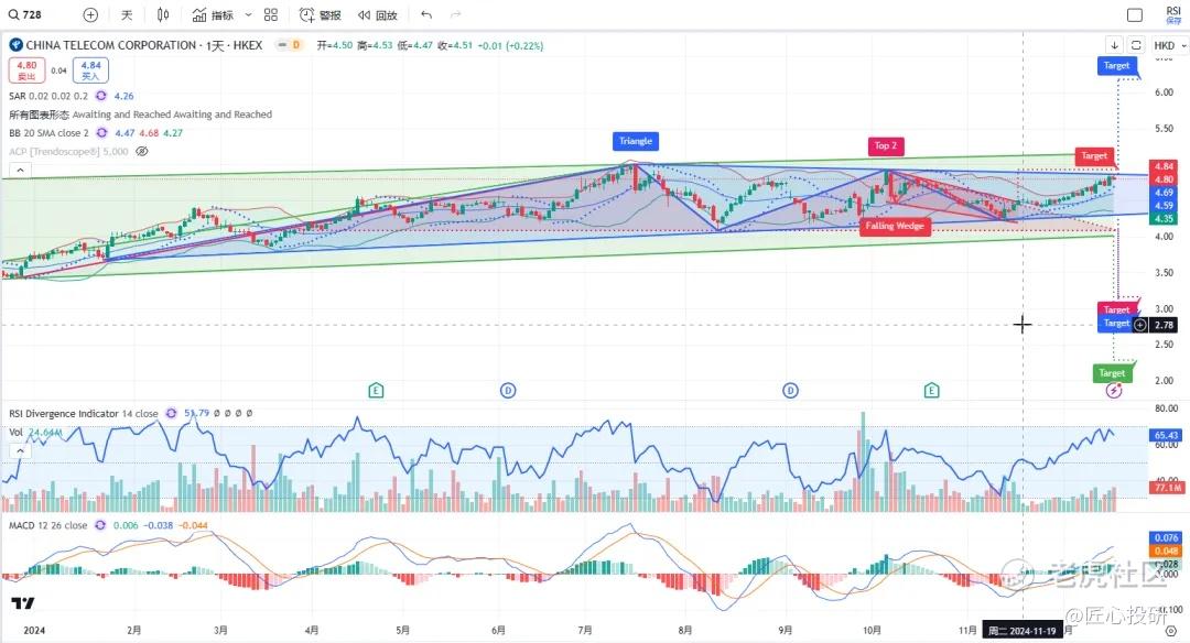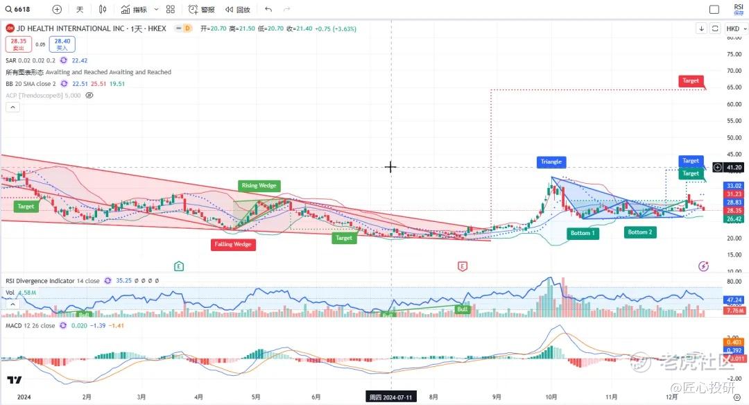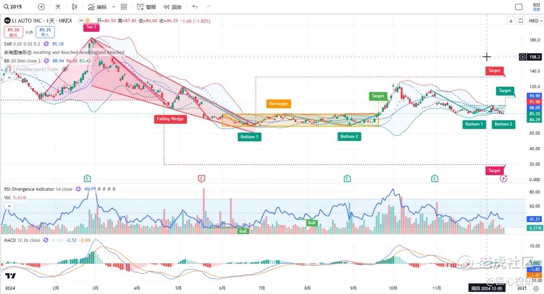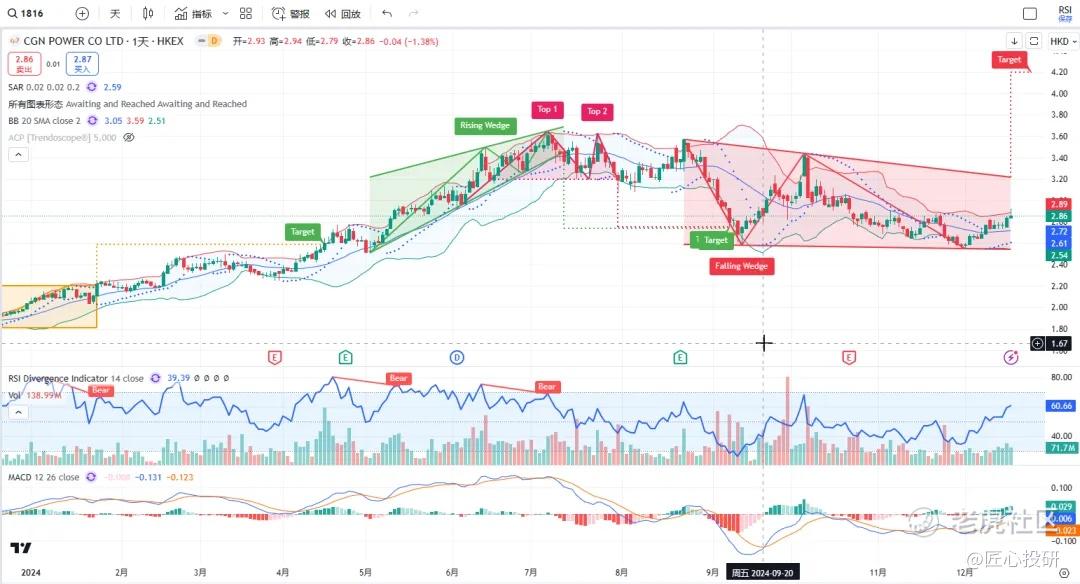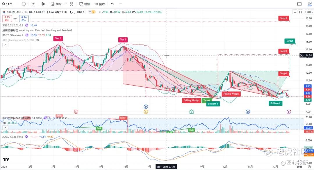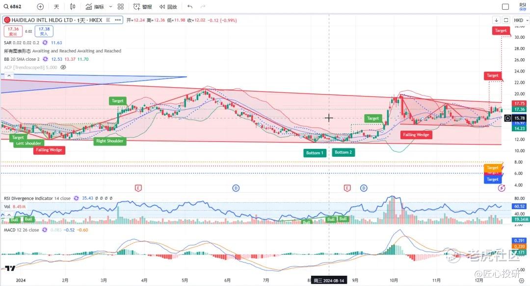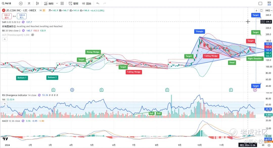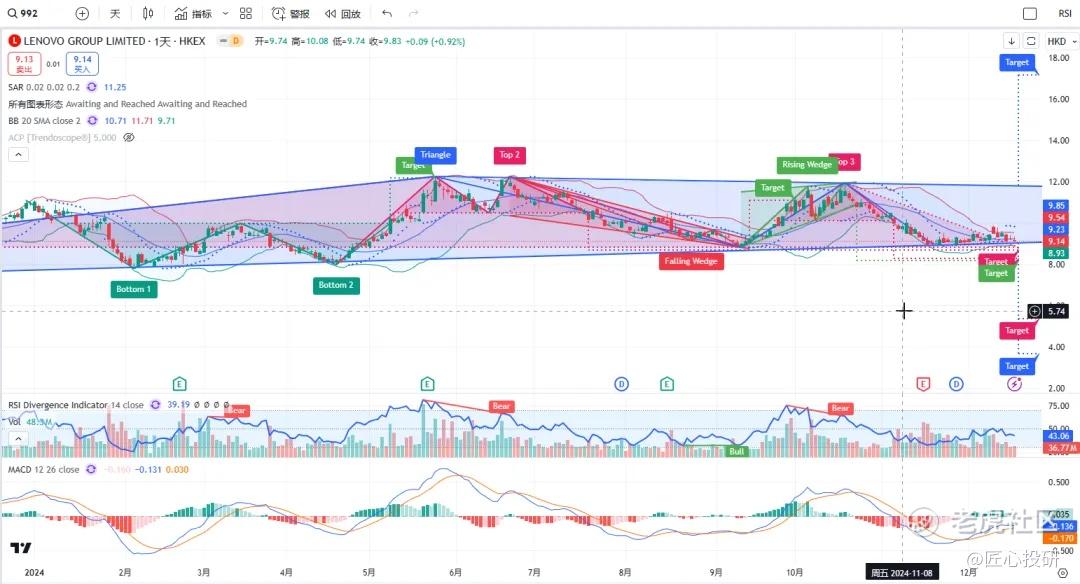 关于目标价:图中标注的“Target”是对应形态的理论目标价位。请注意,目标价并不保证100%达成,有时也可能失效。(内容比较多,图中没有Target的代表无形态,如果没有特殊说明,那就是无形态无目标价)