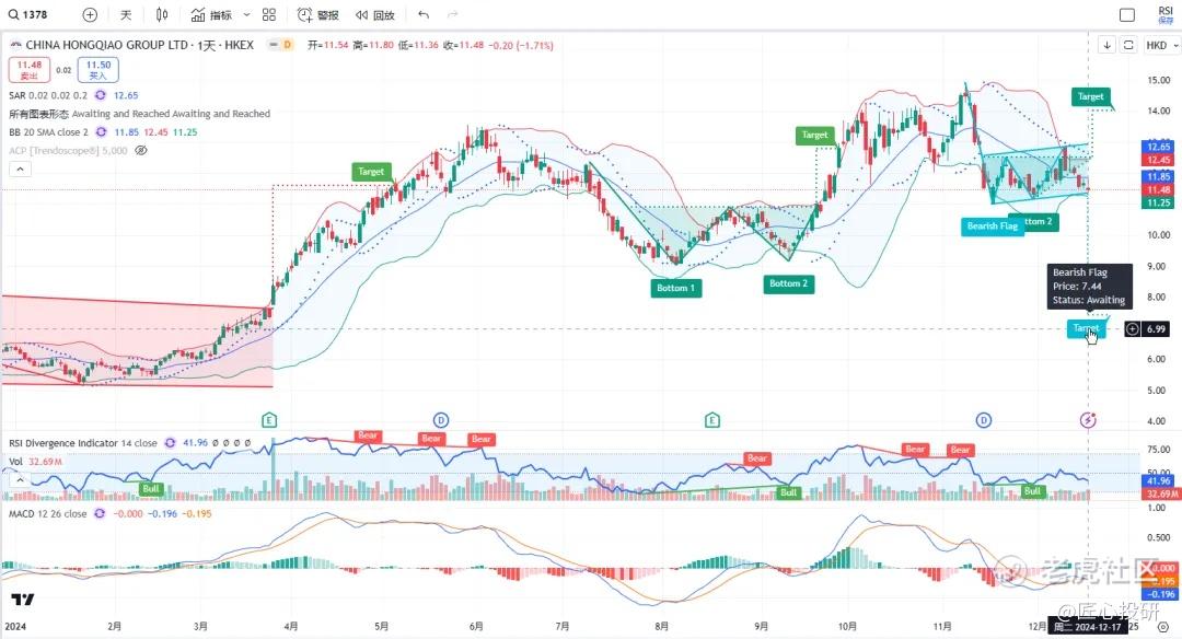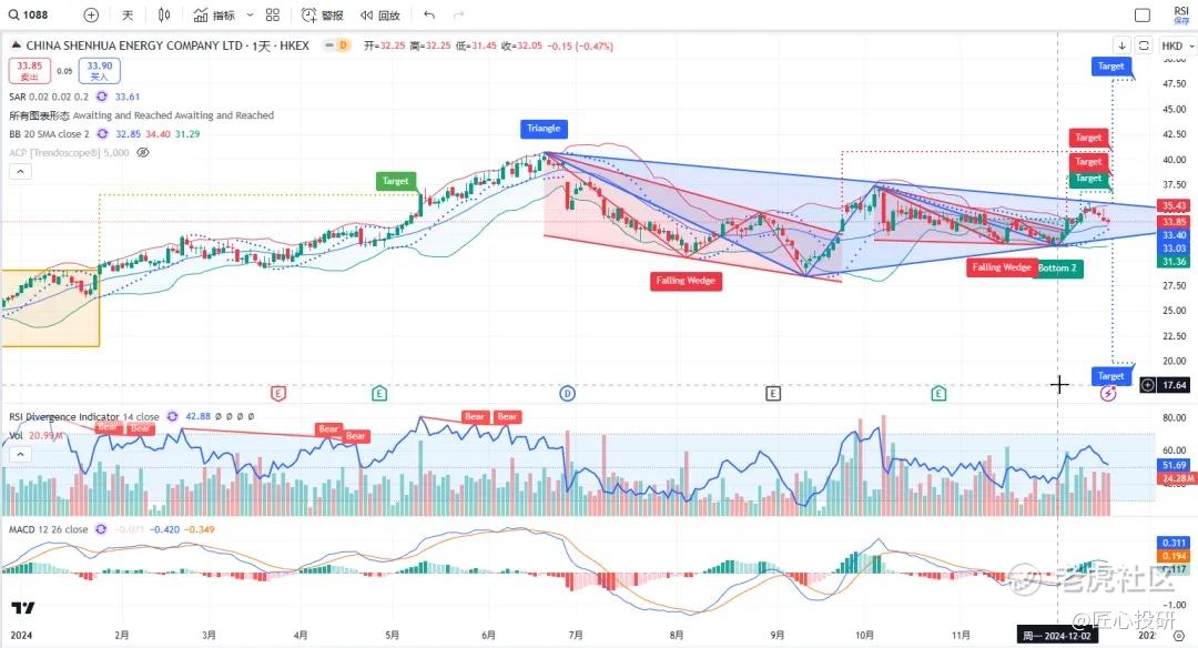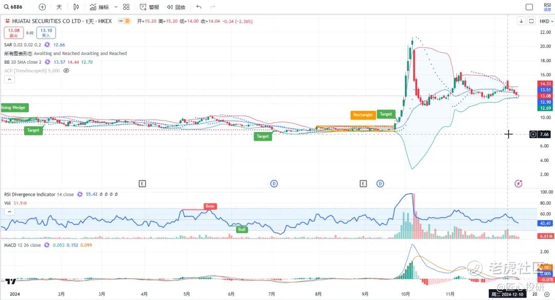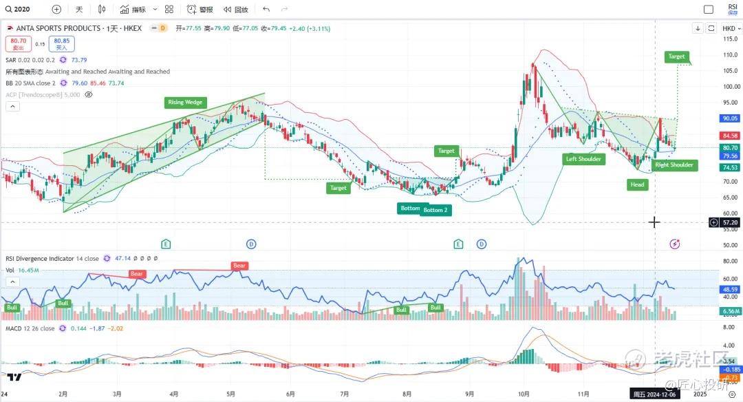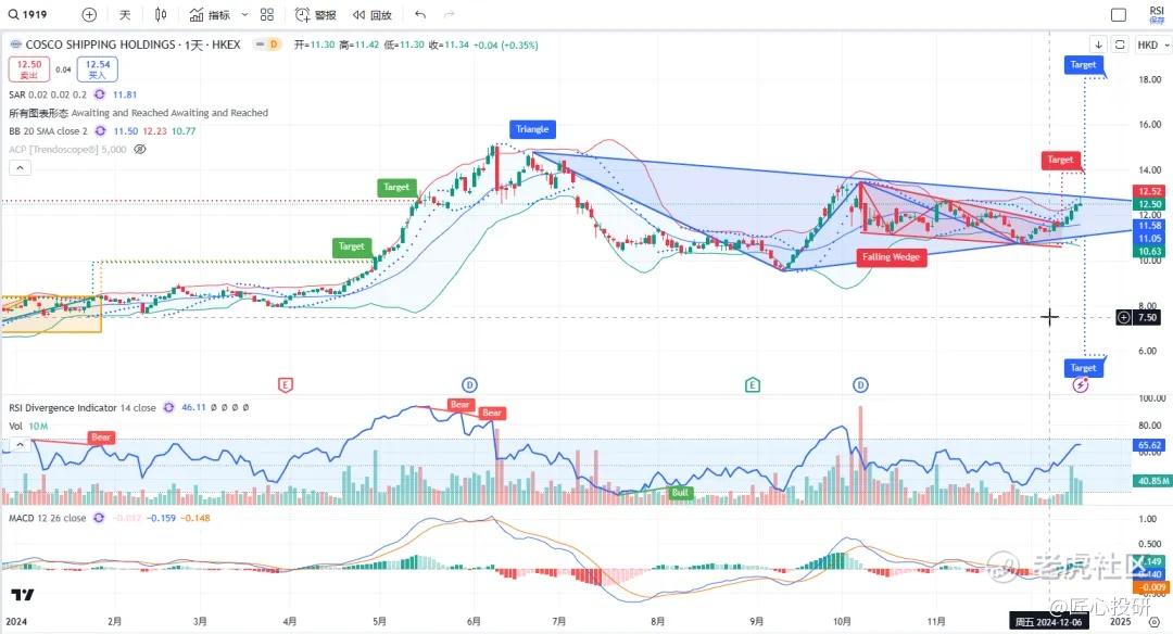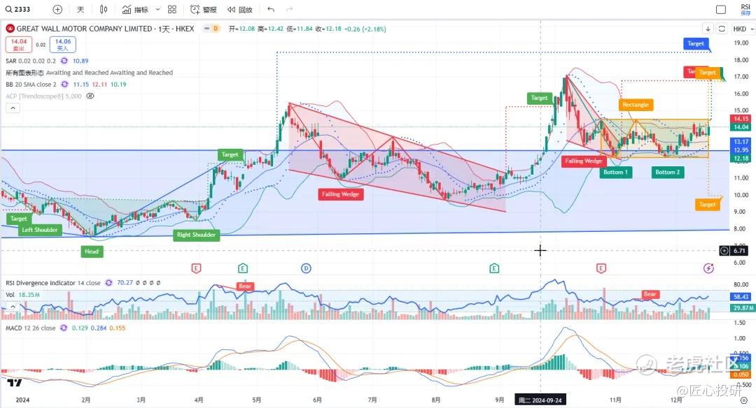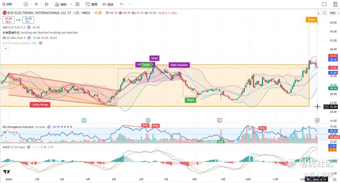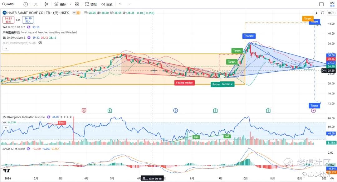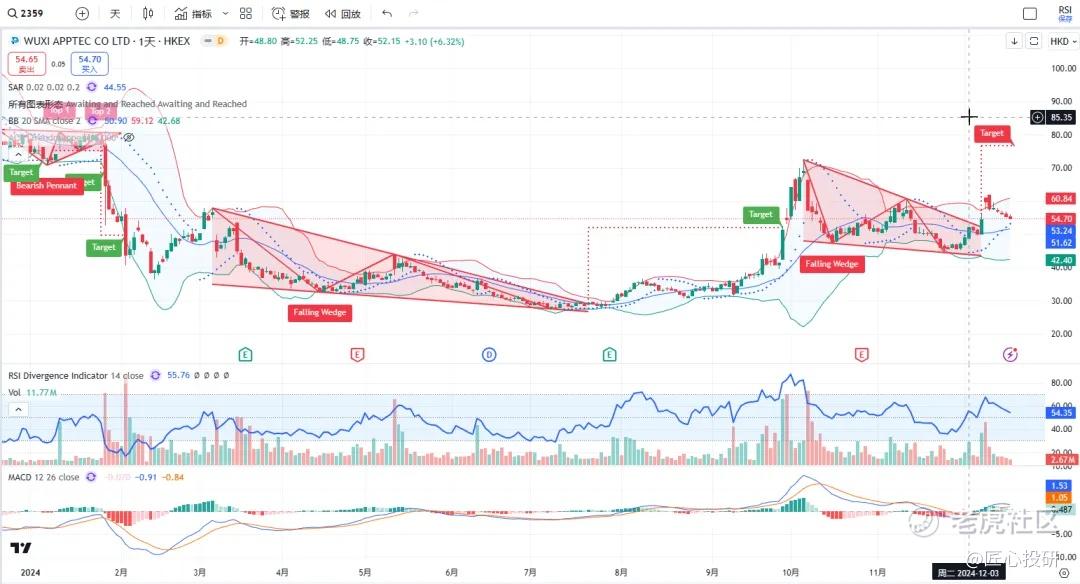 关于目标价:图中标注的“Target”是对应形态的理论目标价位。请注意,目标价并不保证100%达成,有时也可能失效。(内容比较多,图中没有Target的代表无形态,如果没有特殊说明,那就是无形态无目标价)