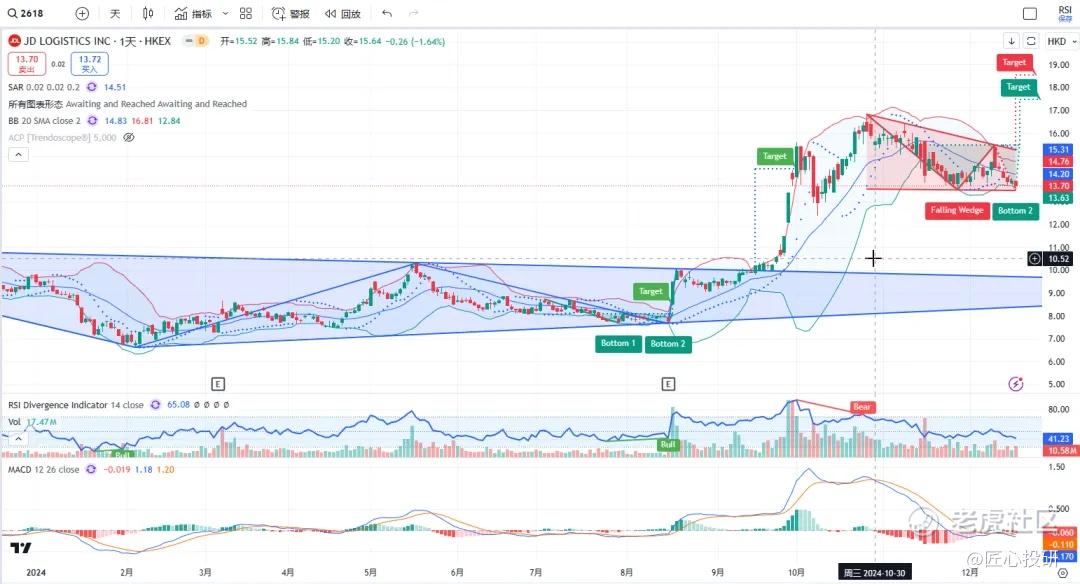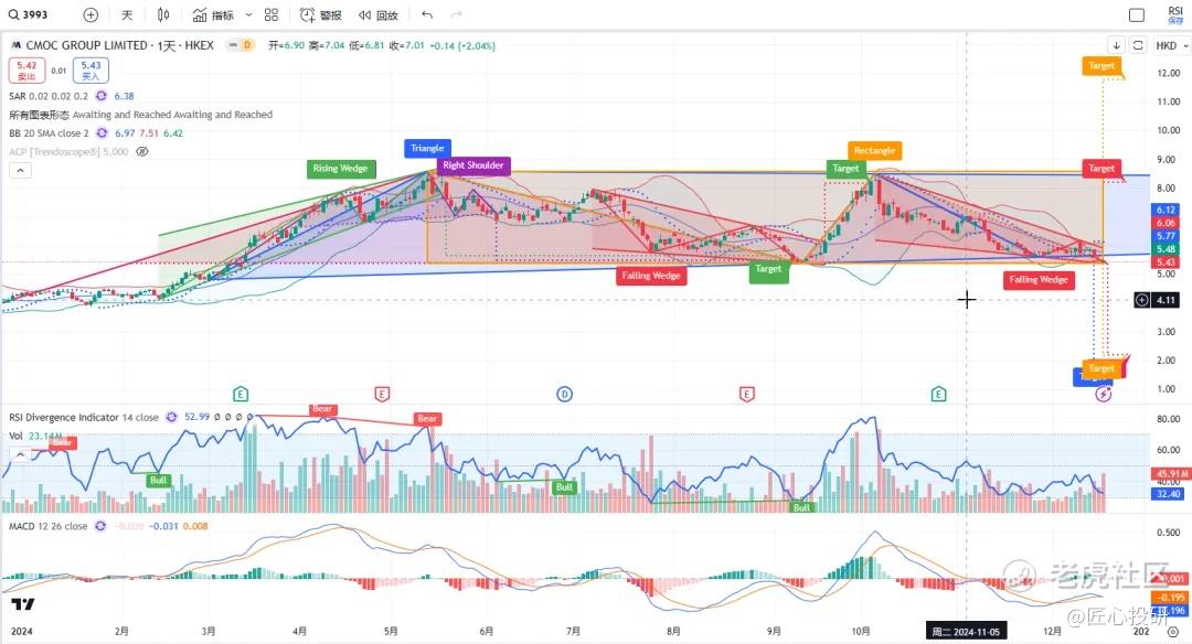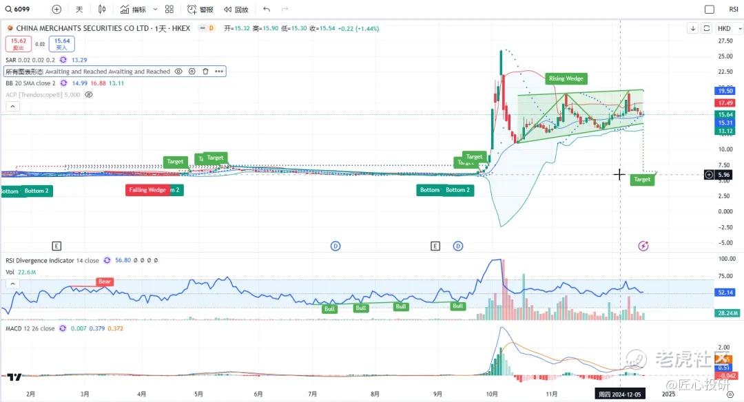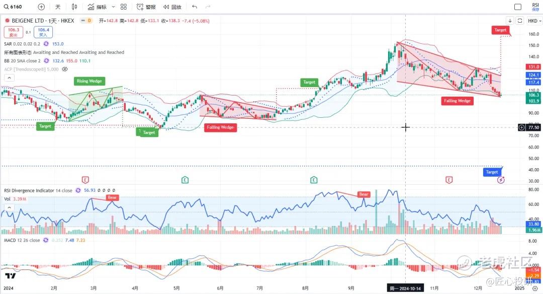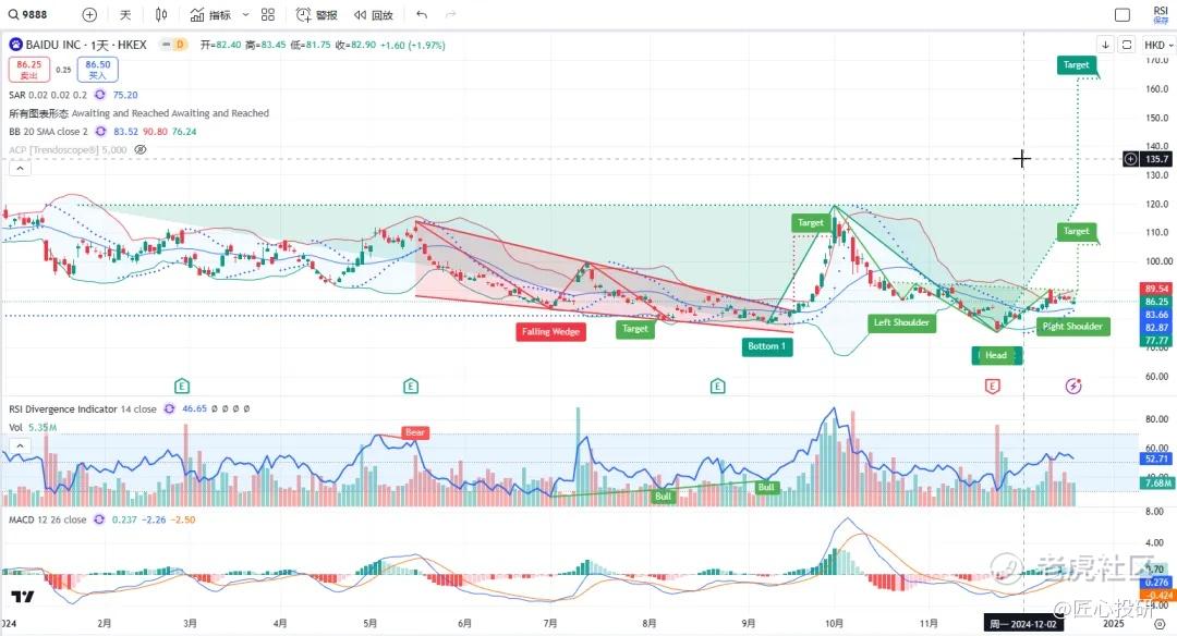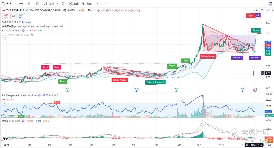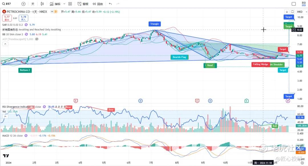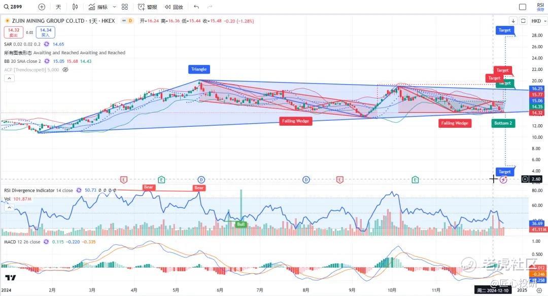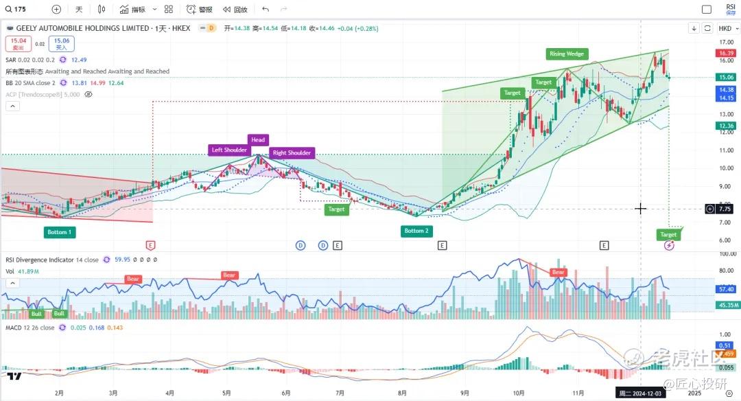 关于目标价:图中标注的“Target”是对应形态的理论目标价位。请注意,目标价并不保证100%达成,有时也可能失效。(内容比较多,图中没有Target的代表无形态,如果没有特殊说明,那就是无形态无目标价)
