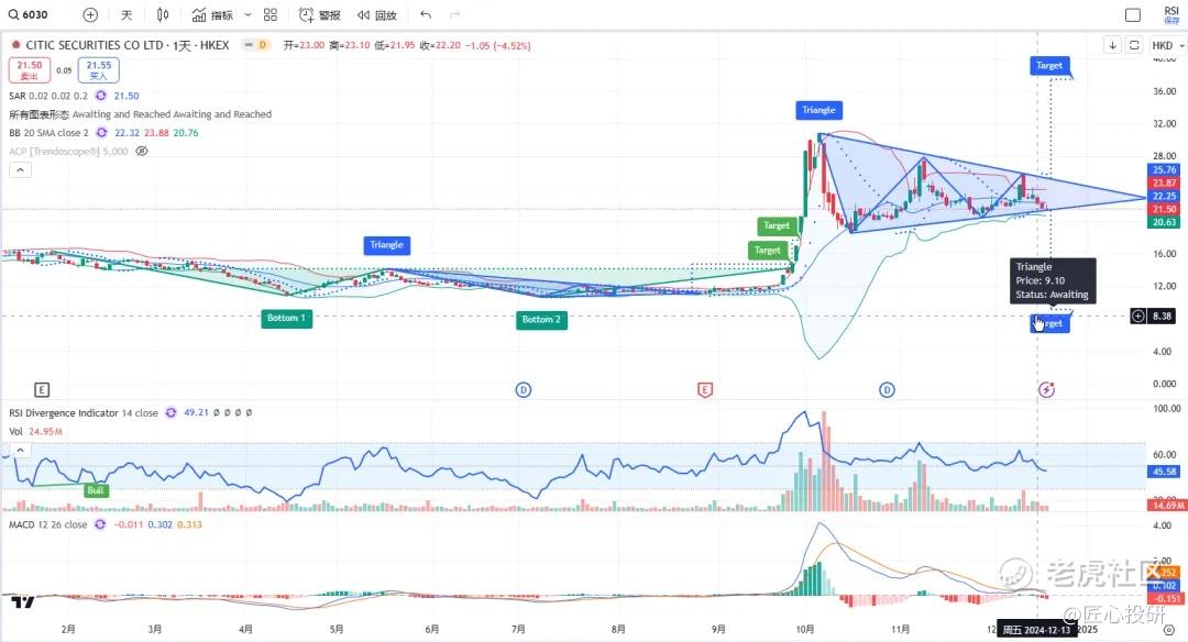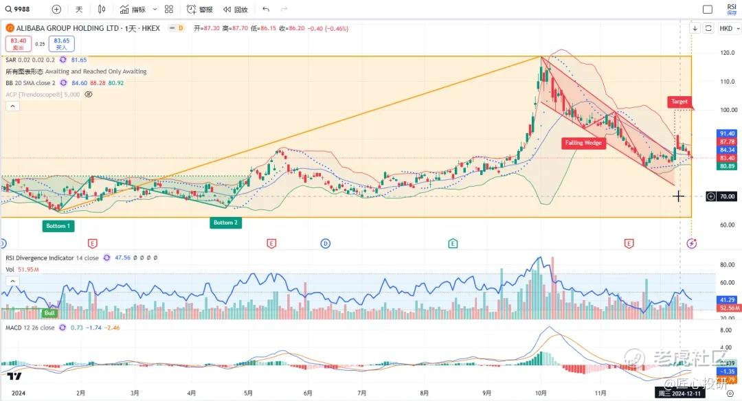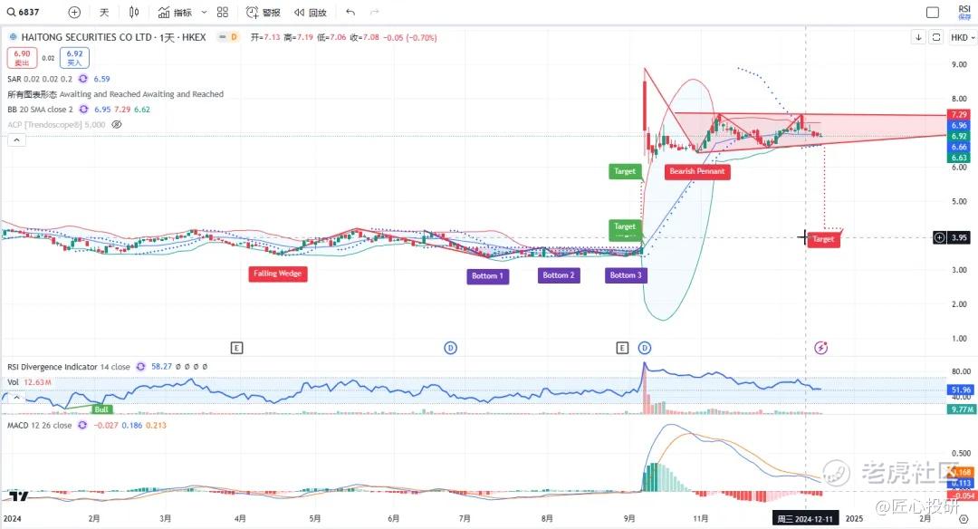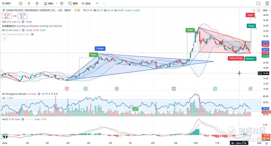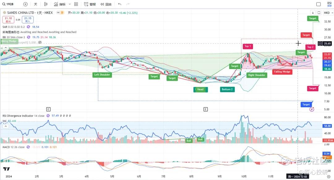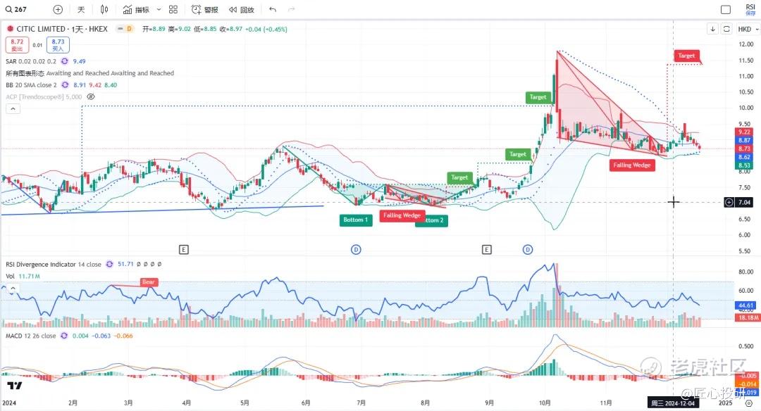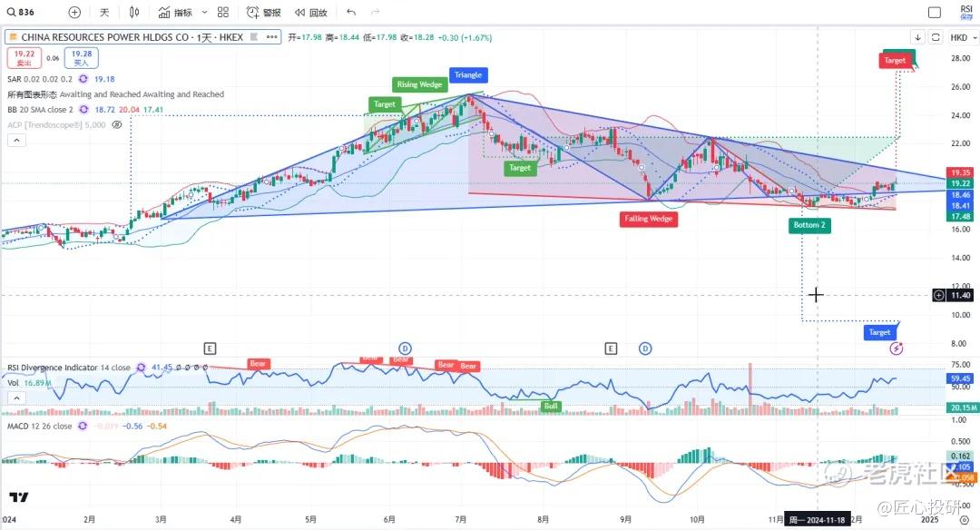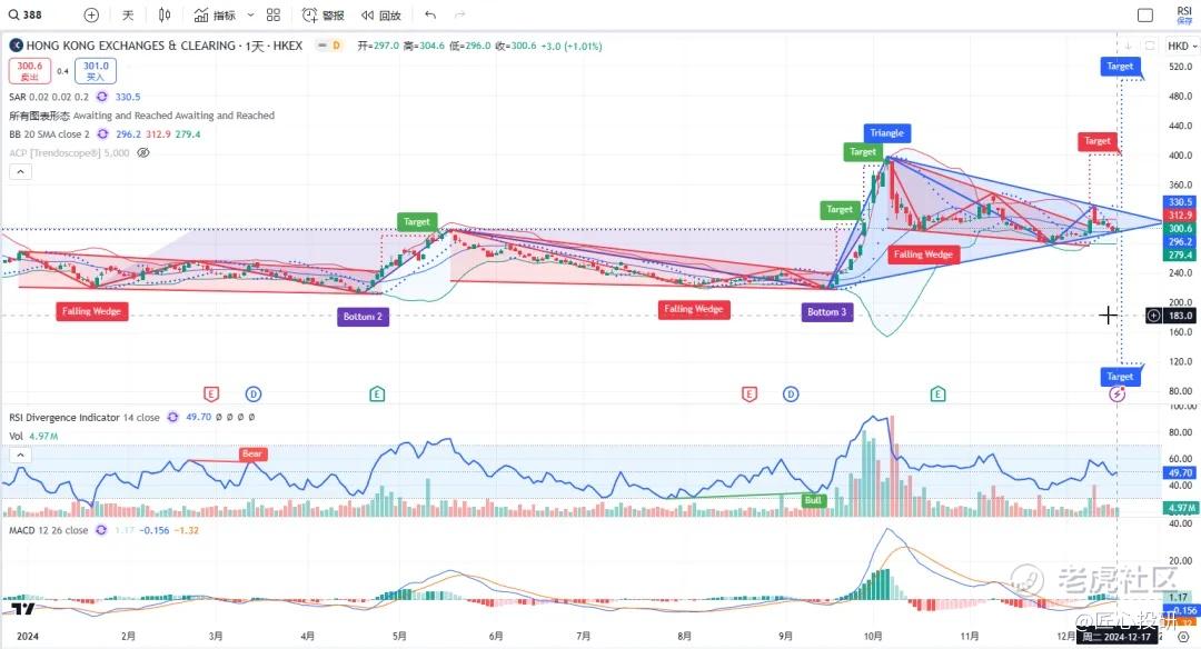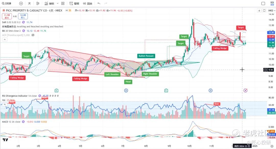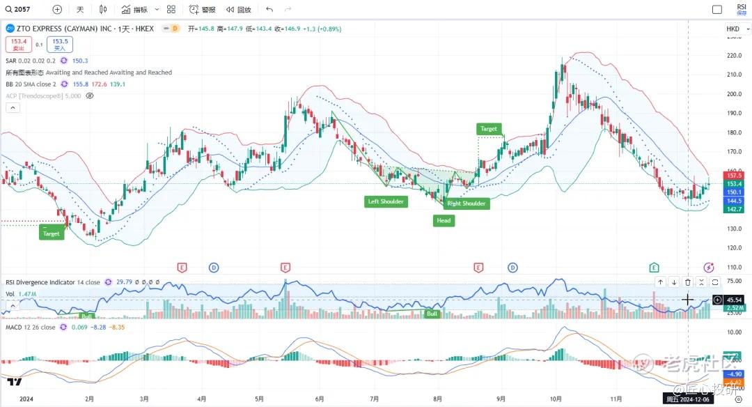 关于目标价:图中标注的“Target”是对应形态的理论目标价位。请注意,目标价并不保证100%达成,有时也可能失效。(内容比较多,图中没有Target的代表无形态,如果没有特殊说明,那就是无形态无目标价)