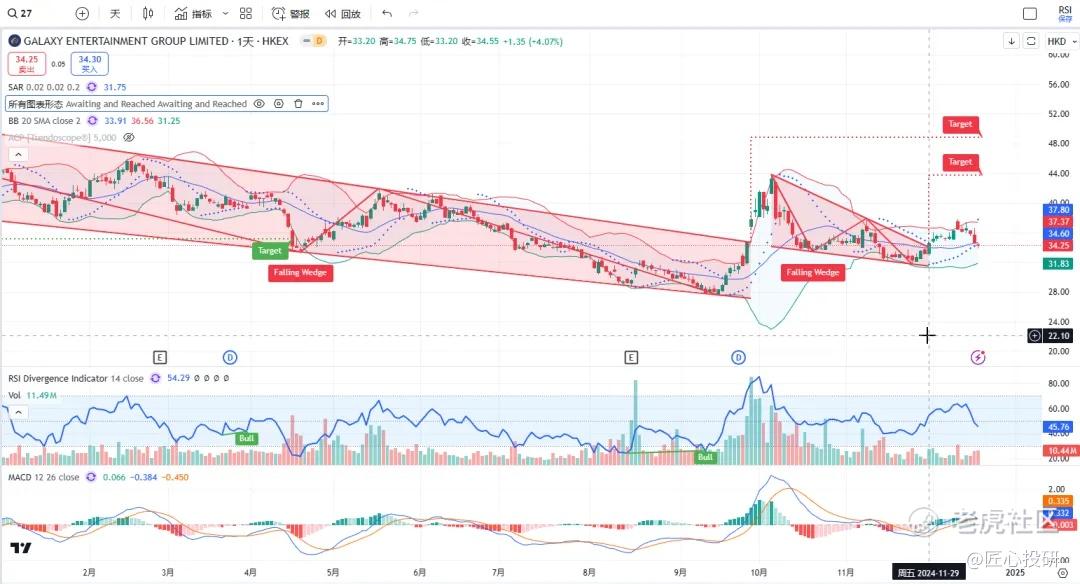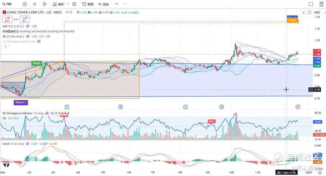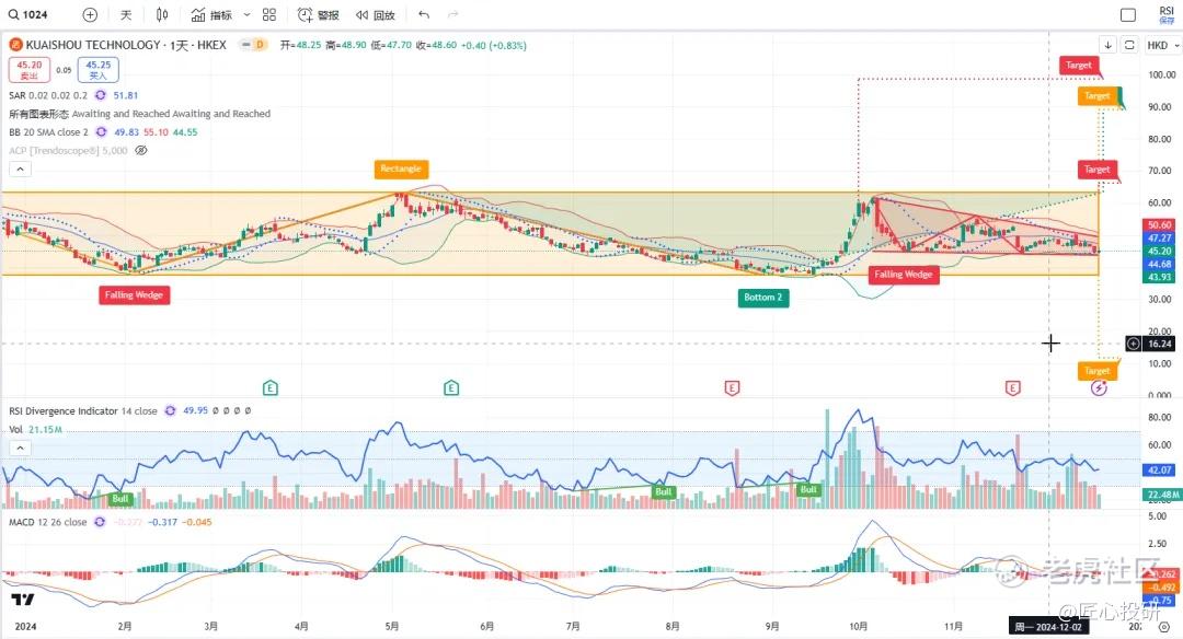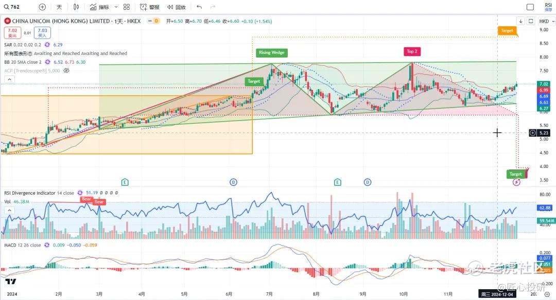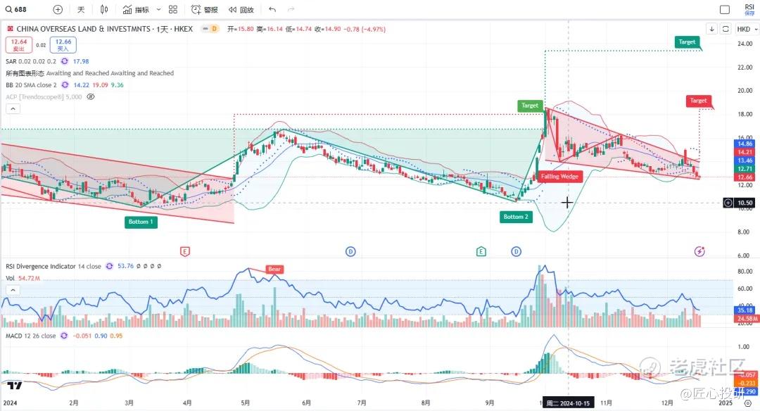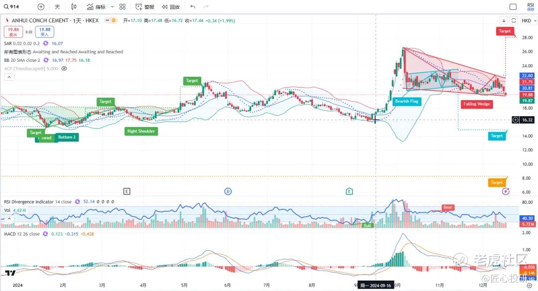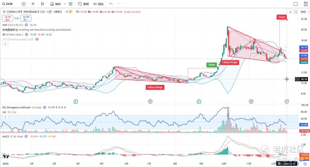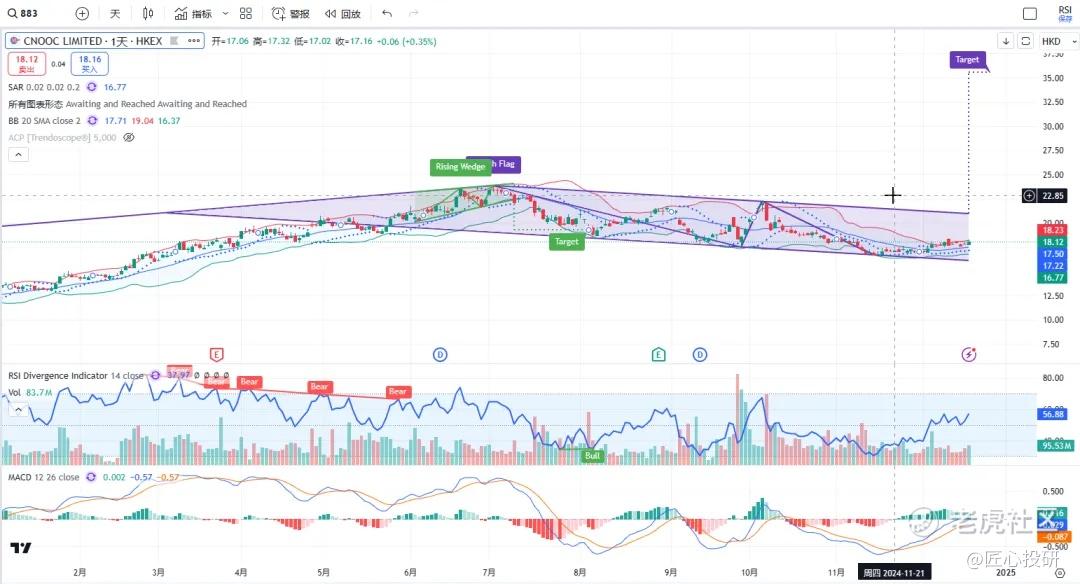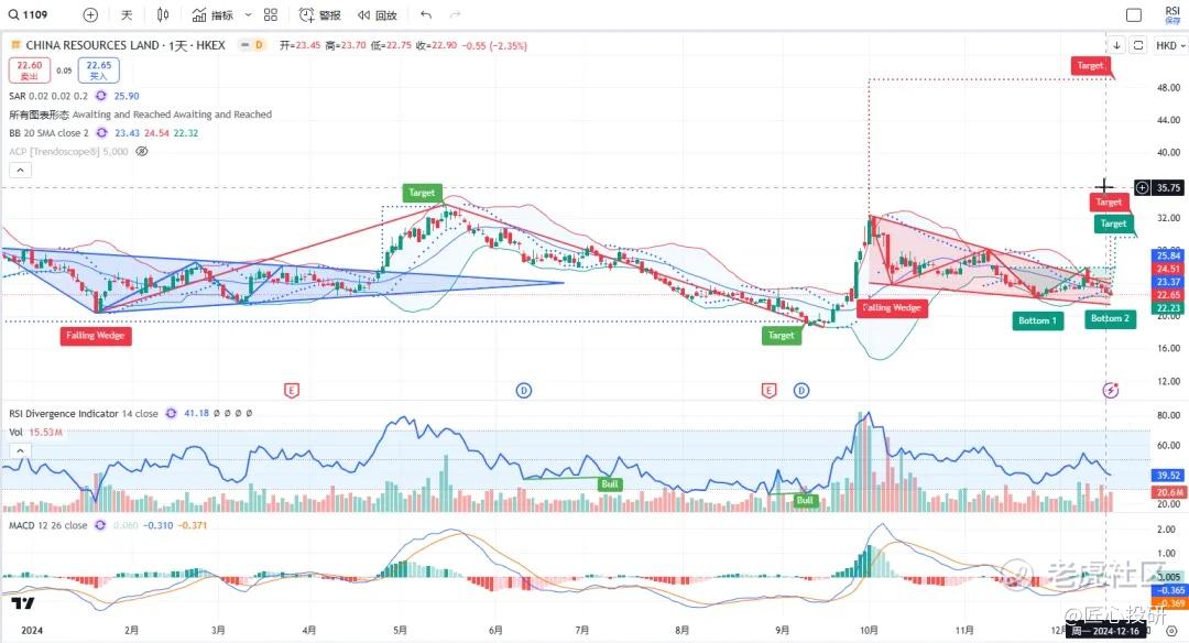 关于目标价:图中标注的“Target”是对应形态的理论目标价位。请注意,目标价并不保证100%达成,有时也可能失效。(内容比较多,图中没有Target的代表无形态,如果没有特殊说明,那就是无形态无目标价)