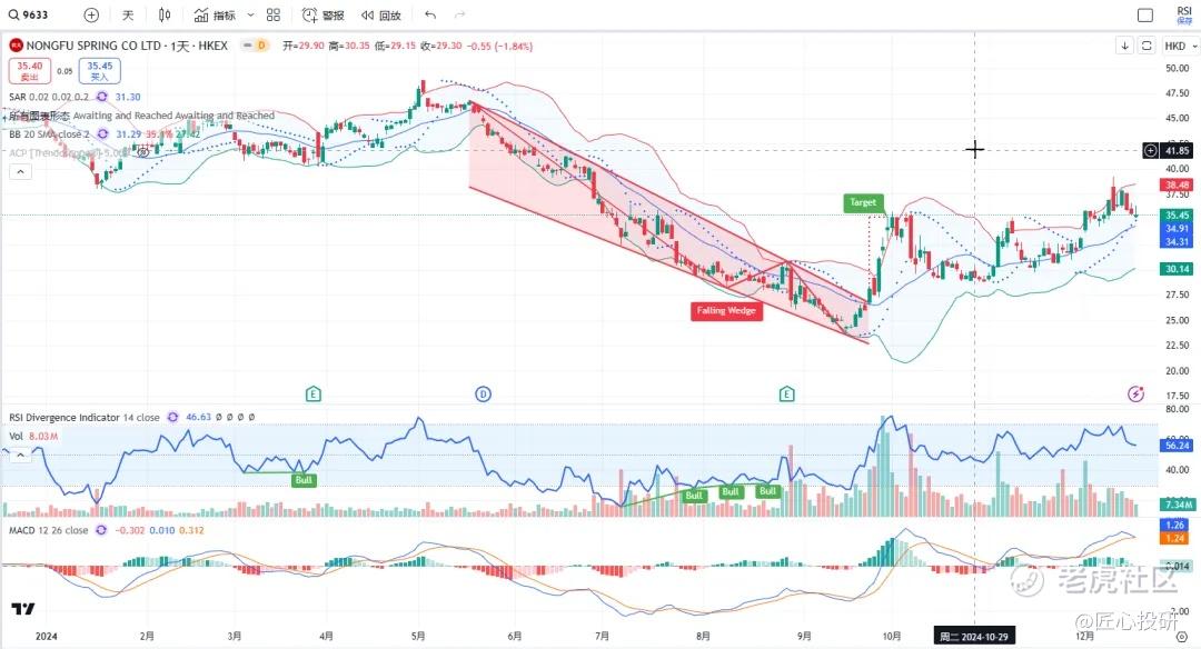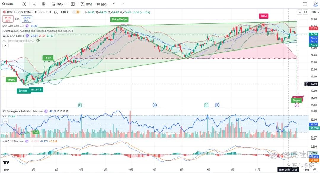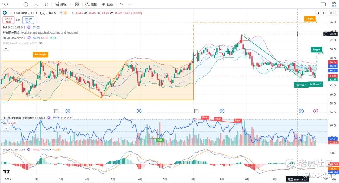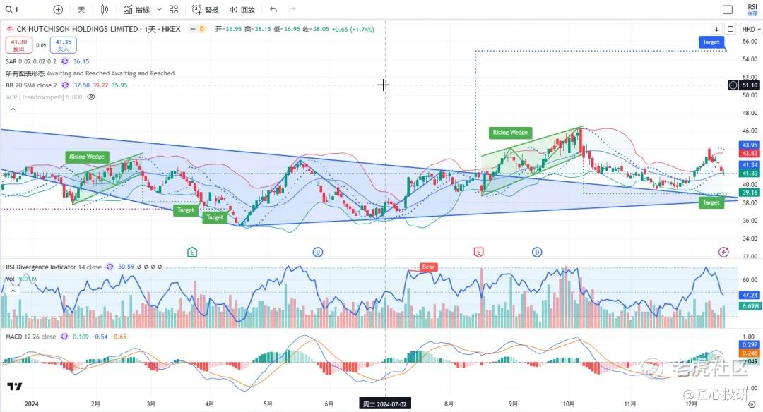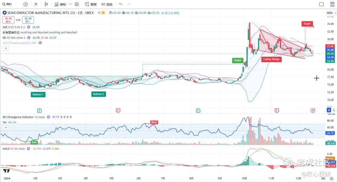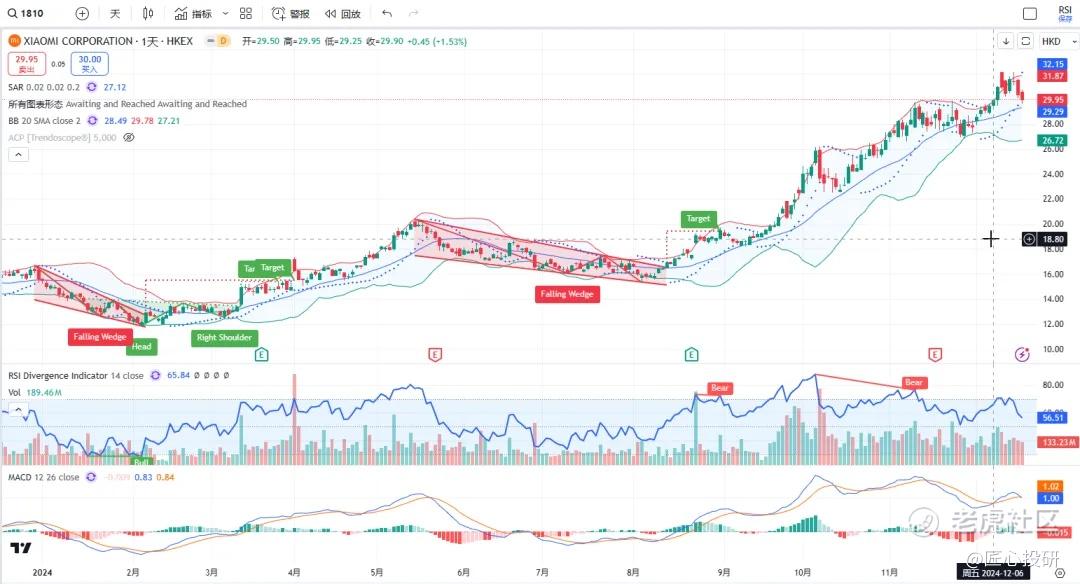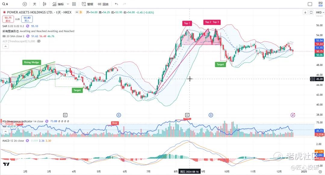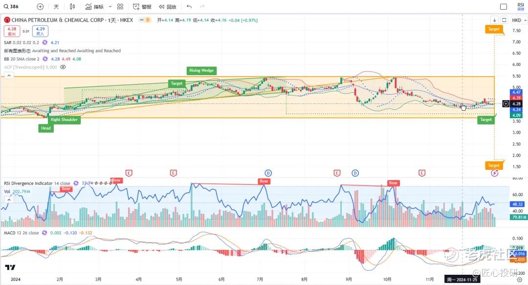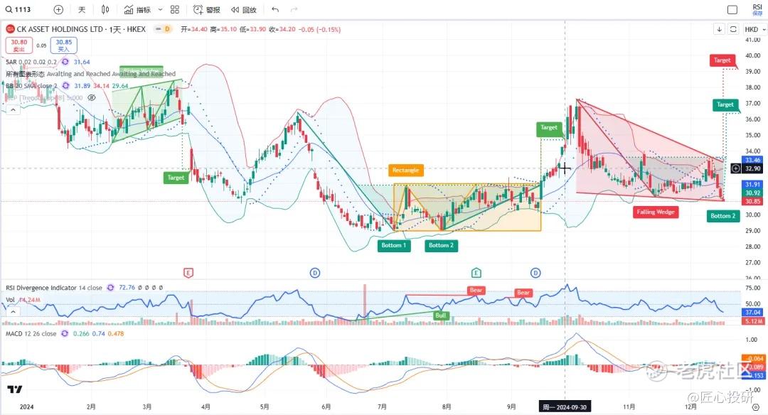关于目标价:图中标注的“Target”是对应形态的理论目标价位。请注意,目标价并不保证100%达成,有时也可能失效。(内容比较多,图中没有Target的代表无形态,如果没有特殊说明,那就是无形态无目标价)