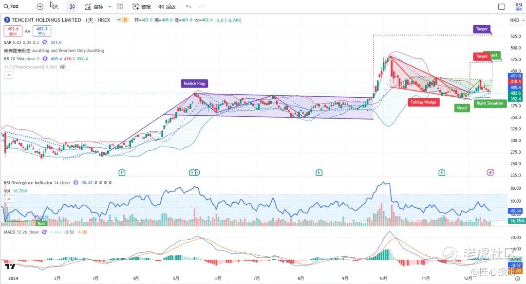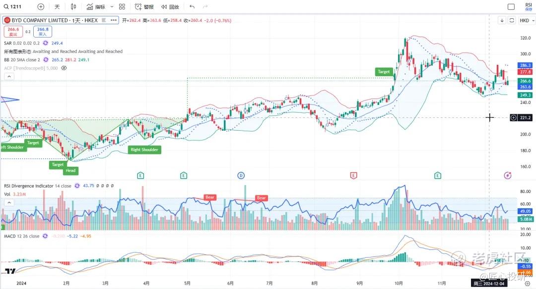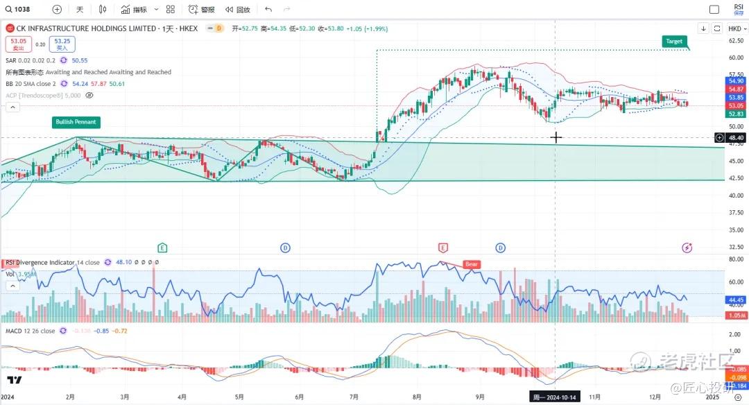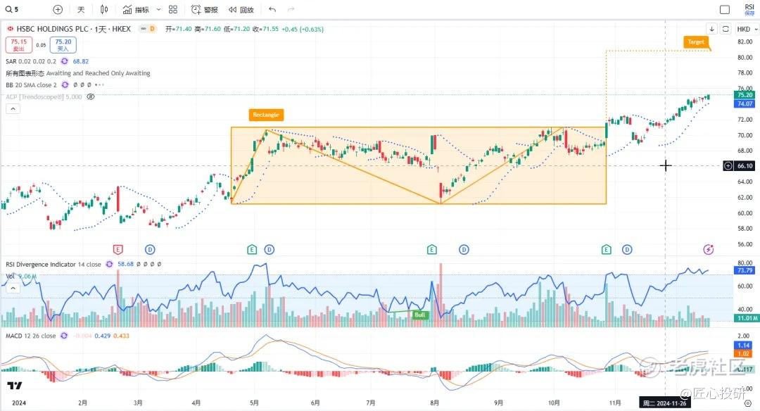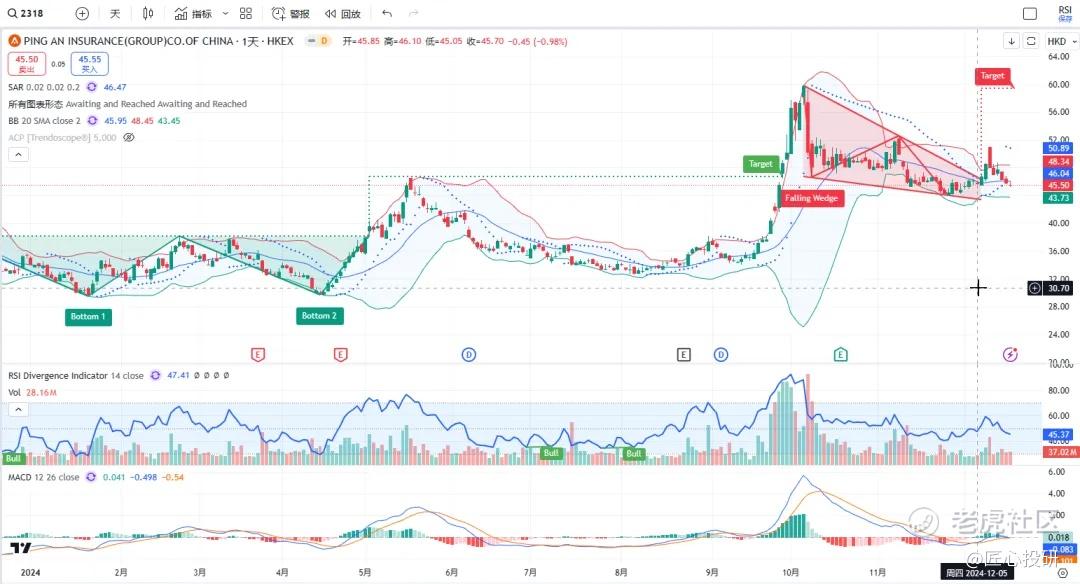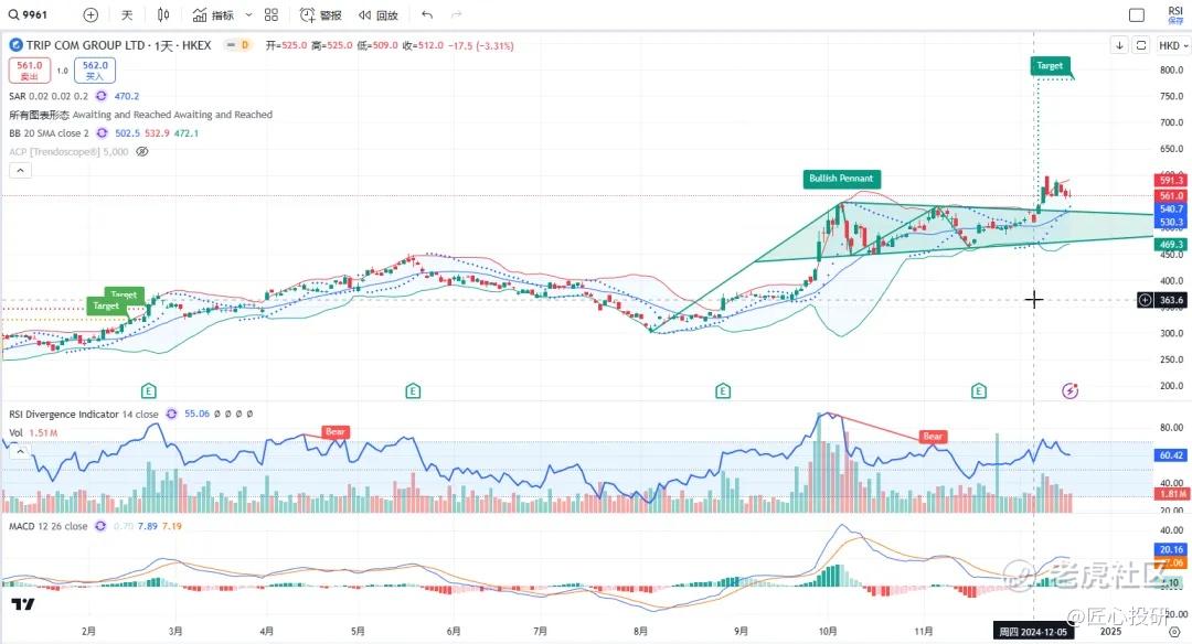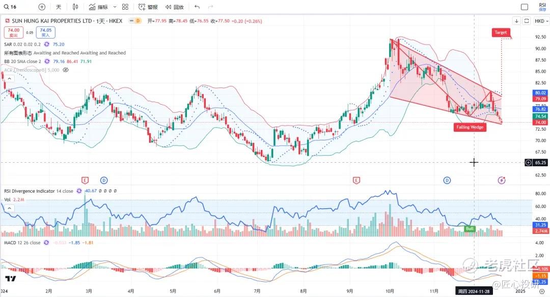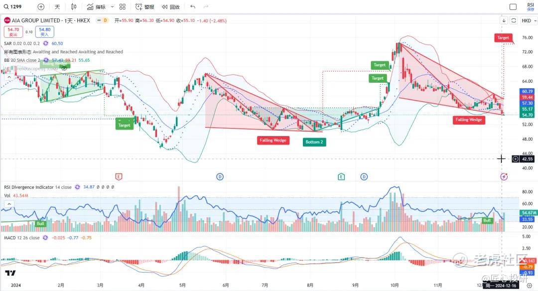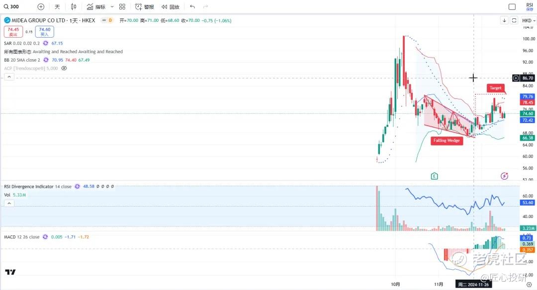 关于目标价:图中标注的“Target”是对应形态的理论目标价位。请注意,目标价并不保证100%达成,有时也可能失效。(内容比较多,图中没有Target的代表无形态,如果没有特殊说明,那就是无形态无目标价)