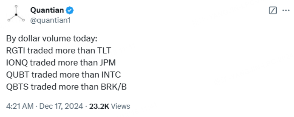 本周一各大概念股的成交量异常惊人,Rigetti Computing成交量超过了美债ETF TLT,IonQ的成交量超过了摩根大通,Quantum Computing的成交量超过了英特尔,D-Wave Quantum的成交量超过了巴菲特旗下的伯克希尔。。。[嘘]