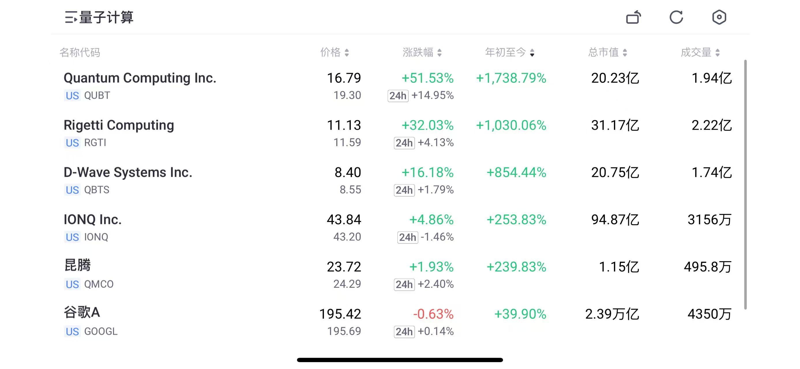 $谷歌A(GOOGL)$ 现在已经彻底被量子计算救活了,量子计算概念近期大热,虽然还没有投产和盈利方面的利好,但是市场现在是非常fomo的。