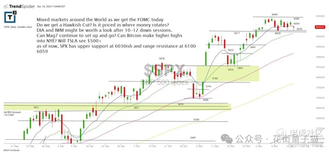 全球市场走势不一,今日FOMC会议引发关注。我们会看到鹰派降息吗?资金流向是否已经体现?DIA 和 IWM 可能值得在10-12个回调日后观察。Mag7 是否会继续表现?比特币是否会在年底创出新高?TSLA 会突破 $500+ 吗?目前,SPX 在 6030 点附近有上行支撑,6100-6059 区间构成阻力范围。