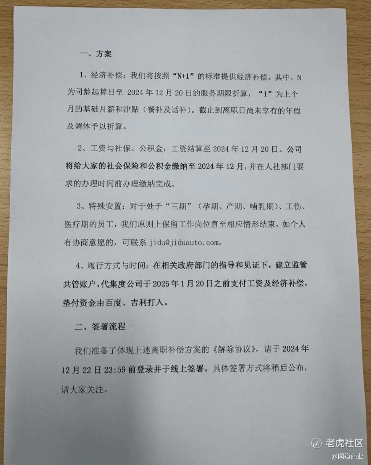 12月19日,一则极越员工的善后方案文件照片在网上曝光。文件显示,在相关政府部门指导和见证下,建立监管共管账户,代极越为员工支付相关费用,垫付资金由百度、吉利打入。