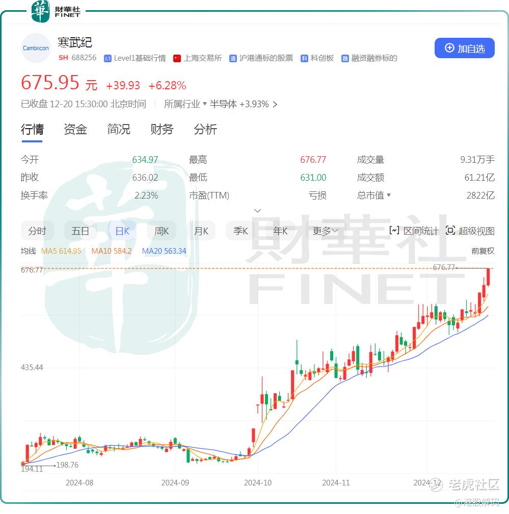 12月20日,AI人气龙头 $寒武纪(688256)$ 继续大涨6.28%,可谓A股最靓的仔,公司收报675.95元/股,股价仅次于 $贵州茅台(600519)$的1522元/股,领先于 $北方华创(002371)$ 的414.2元/股,属于A股第二贵的股票。