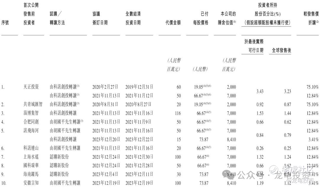 讯飞医疗科技IPO前完成多轮认购和转让,最后轮安徽言知完成于2023年12月,代价金额1亿人民币,约合1.06亿港元,每股成本73.87元人民币,约合78.65港元,较发售价折让3.41%,IPO前投资者禁售期12个月。