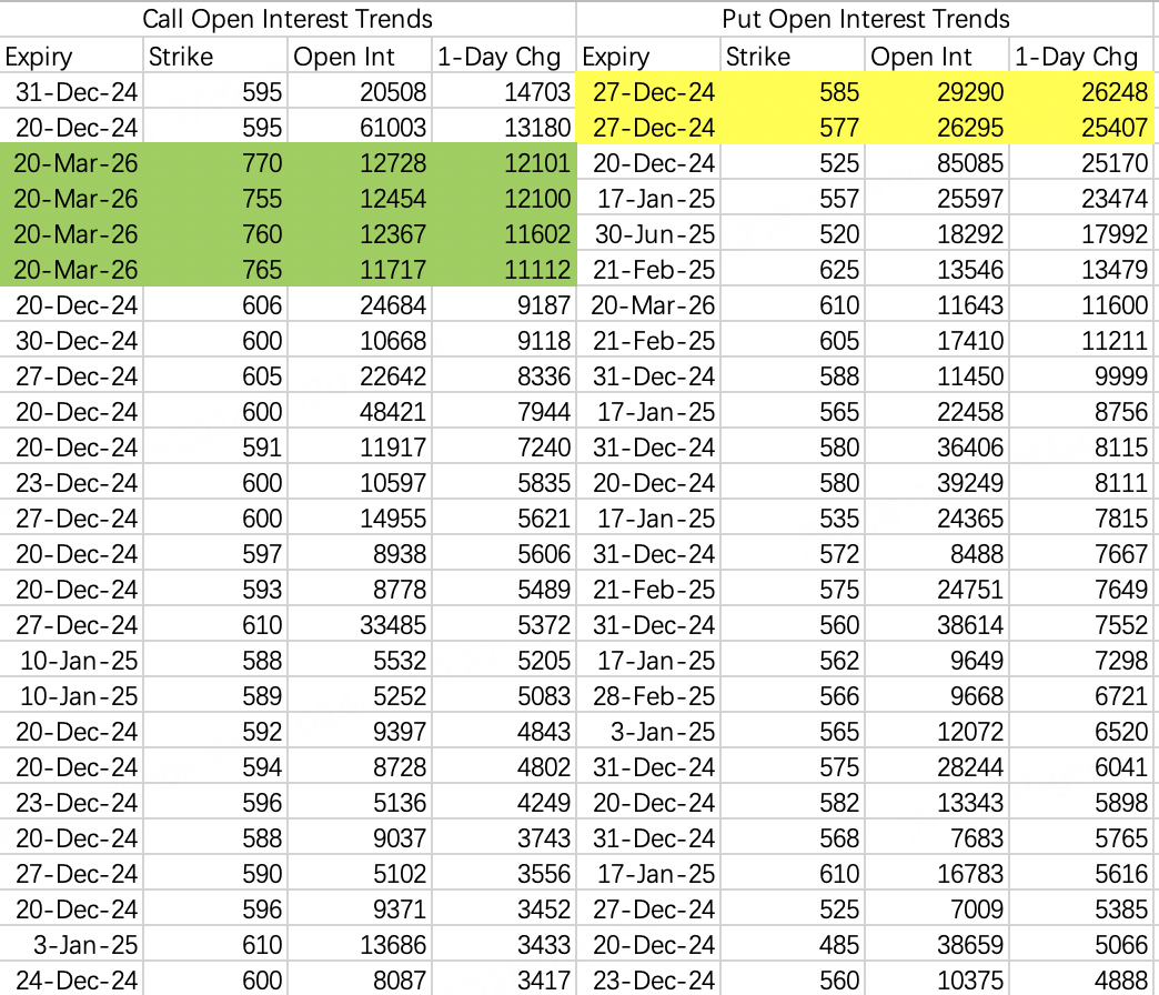 最需要注意的是看跌期权开仓,排名第一第二是一组大单,区间非常明确,预计下周spy会逐步靠近577,买入585put卖出577put: