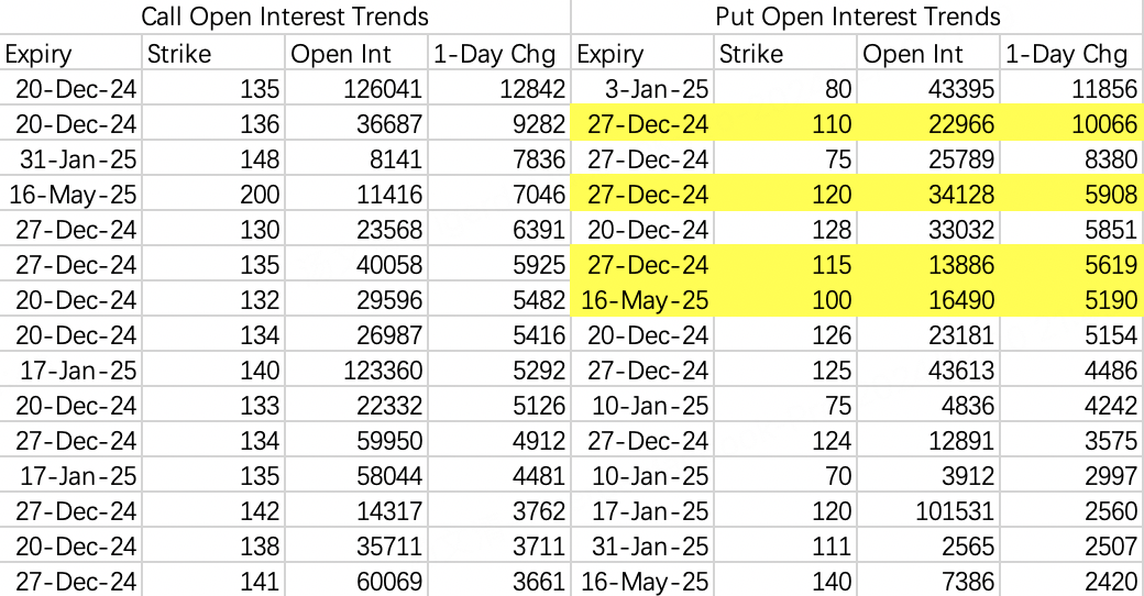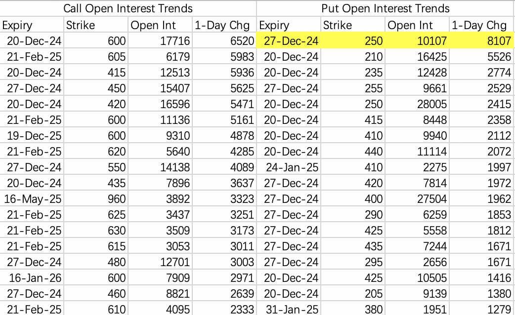 12月27日当周看跌未平仓第一是400,不管股价会不会跌破,下周还是会继续向400靠拢,所以我买了明年1月到期400的put $TSLA 20250117 400.0 PUT$ 卖250put对冲一下磨损 $TSLA 20250117 250.0 PUT$