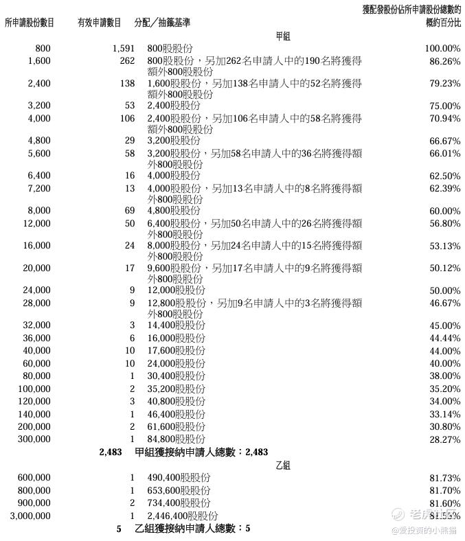 小菜园 (00999.HK)  的乙组官方披露的中签名单里有1人中签490400股,有1人中签653600股,有2人中签734400股,有1人中签2446400股。乙组总共中签505.92万股,货值约4300万港元。