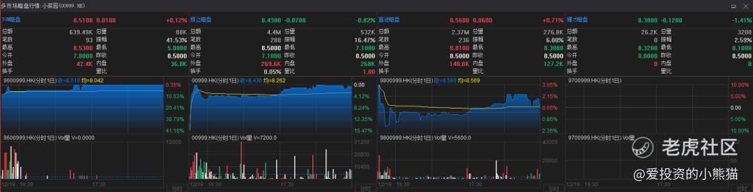 小菜园 (00999.HK) 辉立暗盘以7.10港元低开,立马上冲到最高点8.50港元后就回落,一直到8.02港元止跌,再震荡上行,尾盘以8.43港元报收,跌幅0.82%,振幅16.47%。