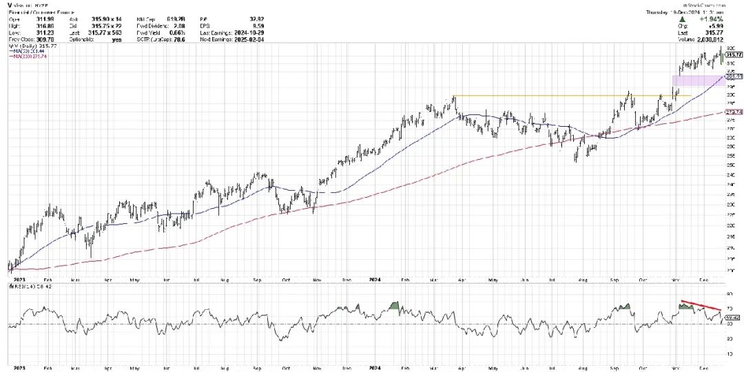 在11月初,Visa完成了一个杯柄形态,并在突破290美元上方时得到最终确认。随后,我们看到选举后的跳空高开,推动Visa首次突破300美元。