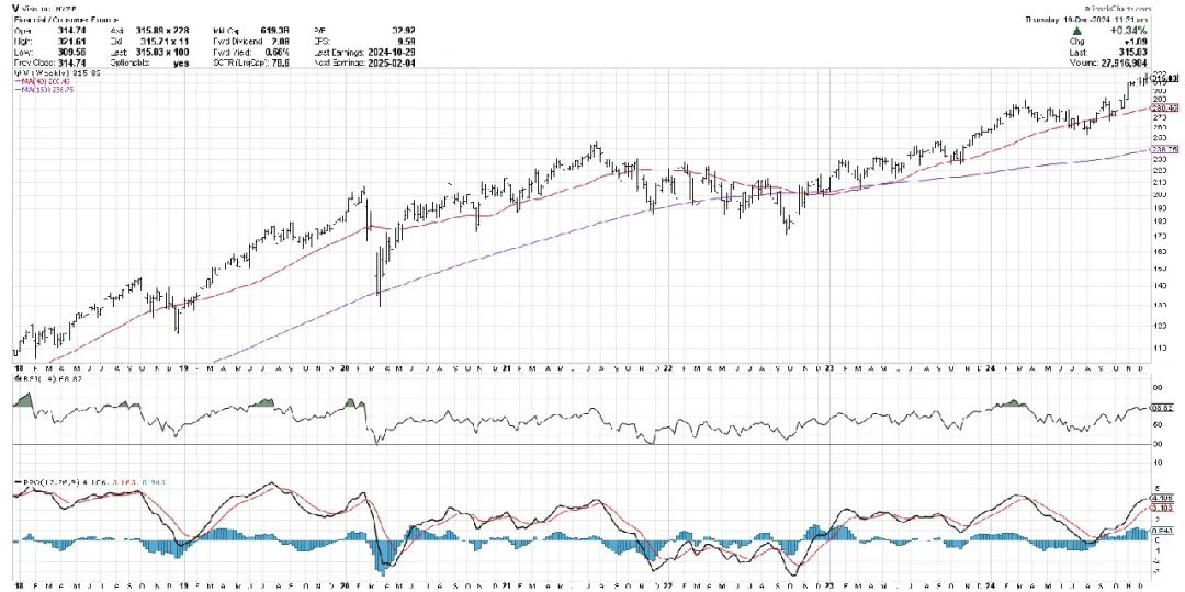 从更长的时间框架来看,Visa的周线图显示了从2022年10月低点开始的长期上涨趋势。在2023年末和2024年中期,股价的回调使其触及40周移动均线。在这两次回调中,周线RSI都在40附近触底,随后很快触发PPO买入信号。