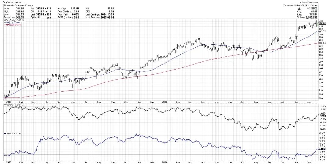 从顶部面板可以看到,Visa当前在两条向上倾斜的移动均线上方运行,这种形态本周仅出现在约20%的标普500成分股图表中。在许多个股显现出明显疲弱信号的情况下,Visa无疑展现出了强劲的表现。