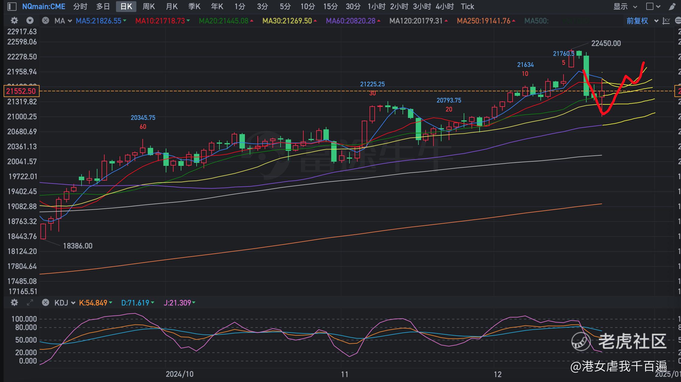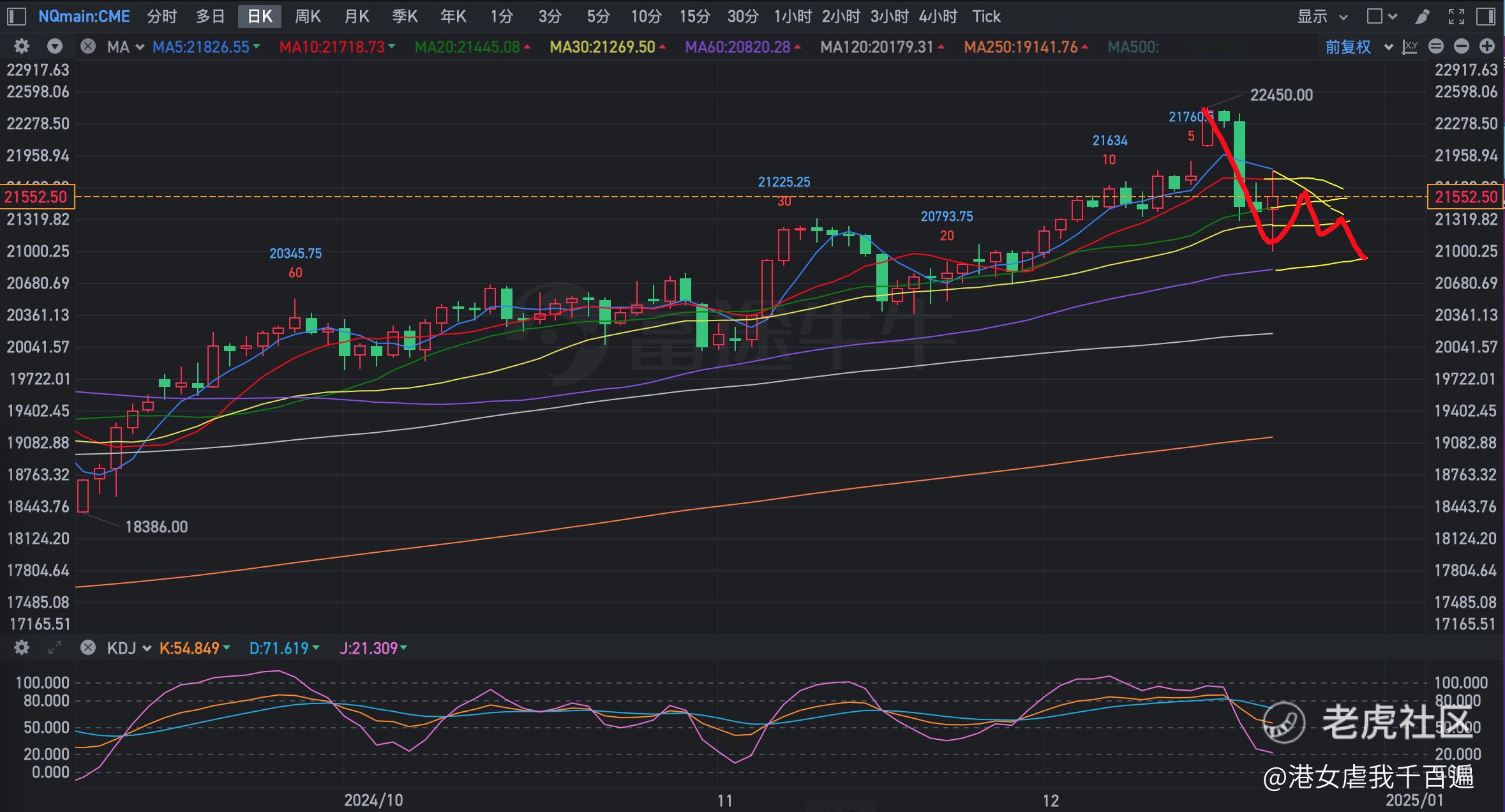 一番预期管理之下,引致美市和比特币两大市场大幅跳水,纳指当天尾盘大跌3.8%,比特币连续回调多日至10万美元下方,但周五PCE数据预示通胀走弱,降息预期小幅升温下,纳指便走出反弹,反弹力度还是不错的,开盘早段时间有约2.6%的涨幅,后遇到MA5的21800附近的压力开始回调。下周一要面对21730的压力,这里能站稳的话,纳指下周就有机会拐回来了。