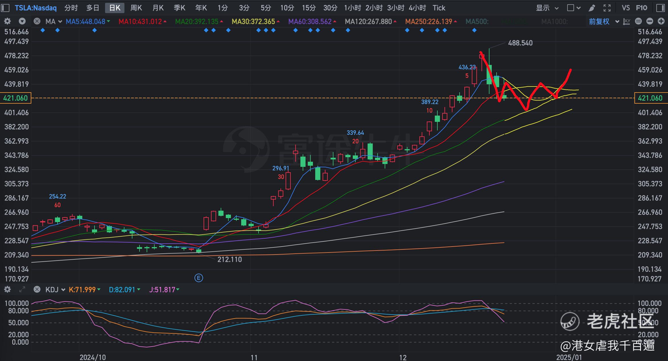 特斯拉,本周三晚冲高到488美元后回落倒跌,走出阶段顶部。周四五两天反弹无力继续下压,回落形态已经比较明显了,预计这次调整要回到401美元附近,才能重新站稳向上了,除非下周能快速涨到442上方并站稳。