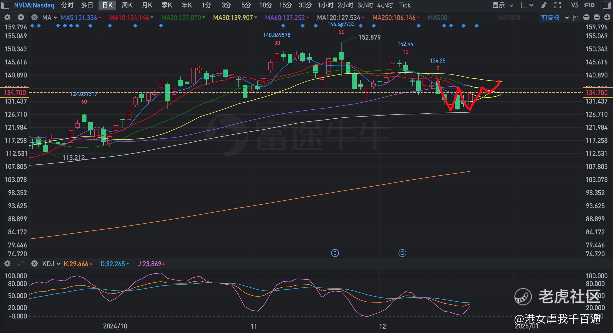 个股方面,近期短线博弈的相信都会关注量子计算概念,一晚上动不动就几十个点甚至一倍的波幅,正股都能玩出期权的感觉,带好止损,还是挺刺激的。英伟达,本周在区间支撑没顶住,周二下跌到MA120的支撑,周五晚上再次反弹上涨超3%,暂时128美元附近做了一个双底,下周需要弹回去136和138美元。