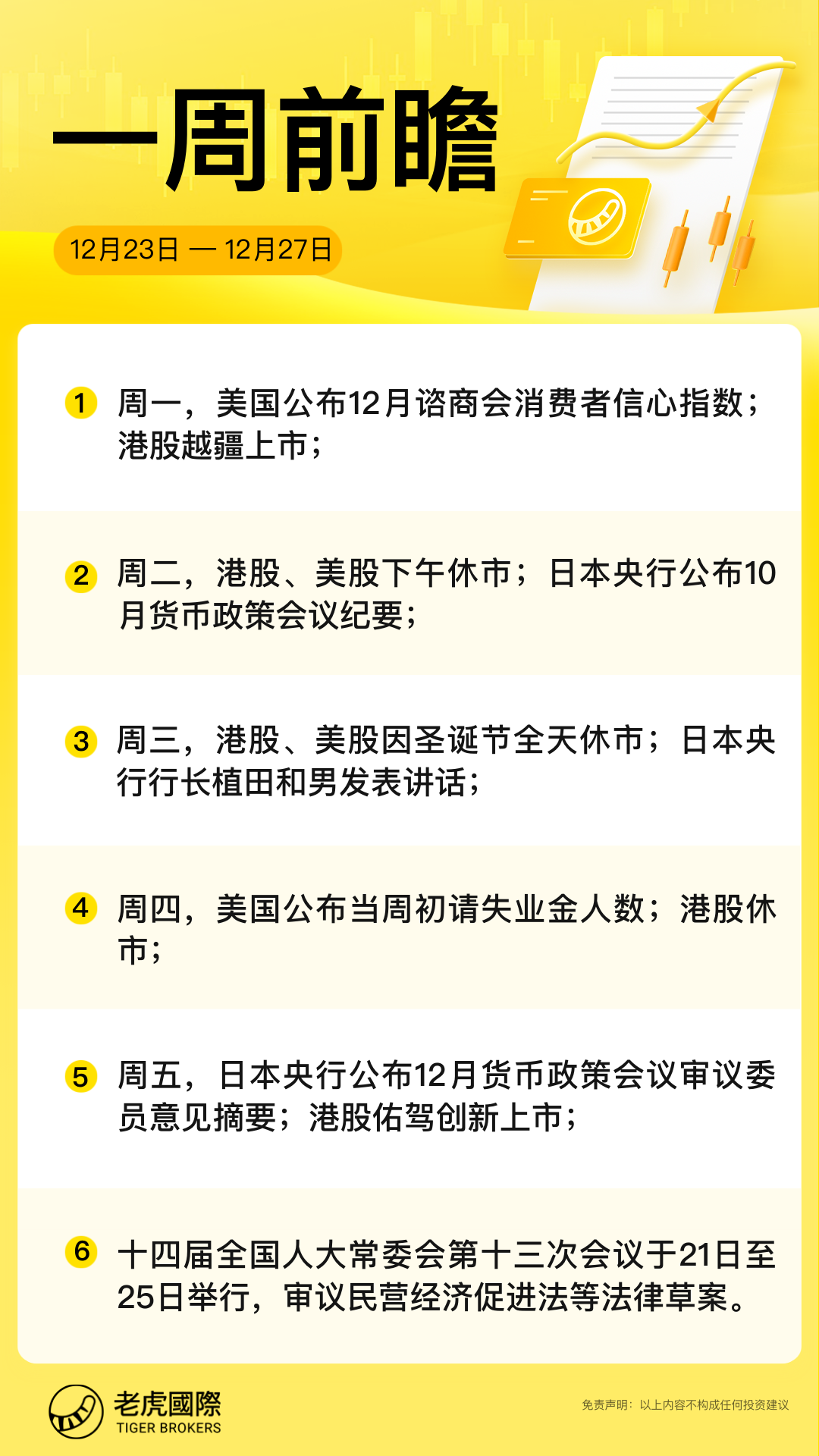 经过了动荡的一周后,圣诞假期来临,本周美国市场事件和经济数据较少。美股市场将于周二提前收盘,周三将因圣诞节休市。