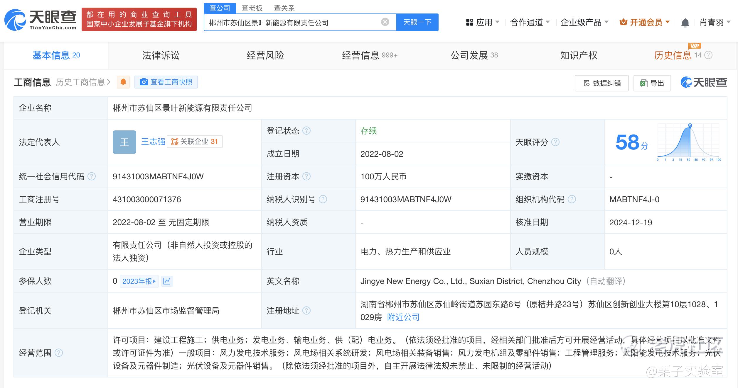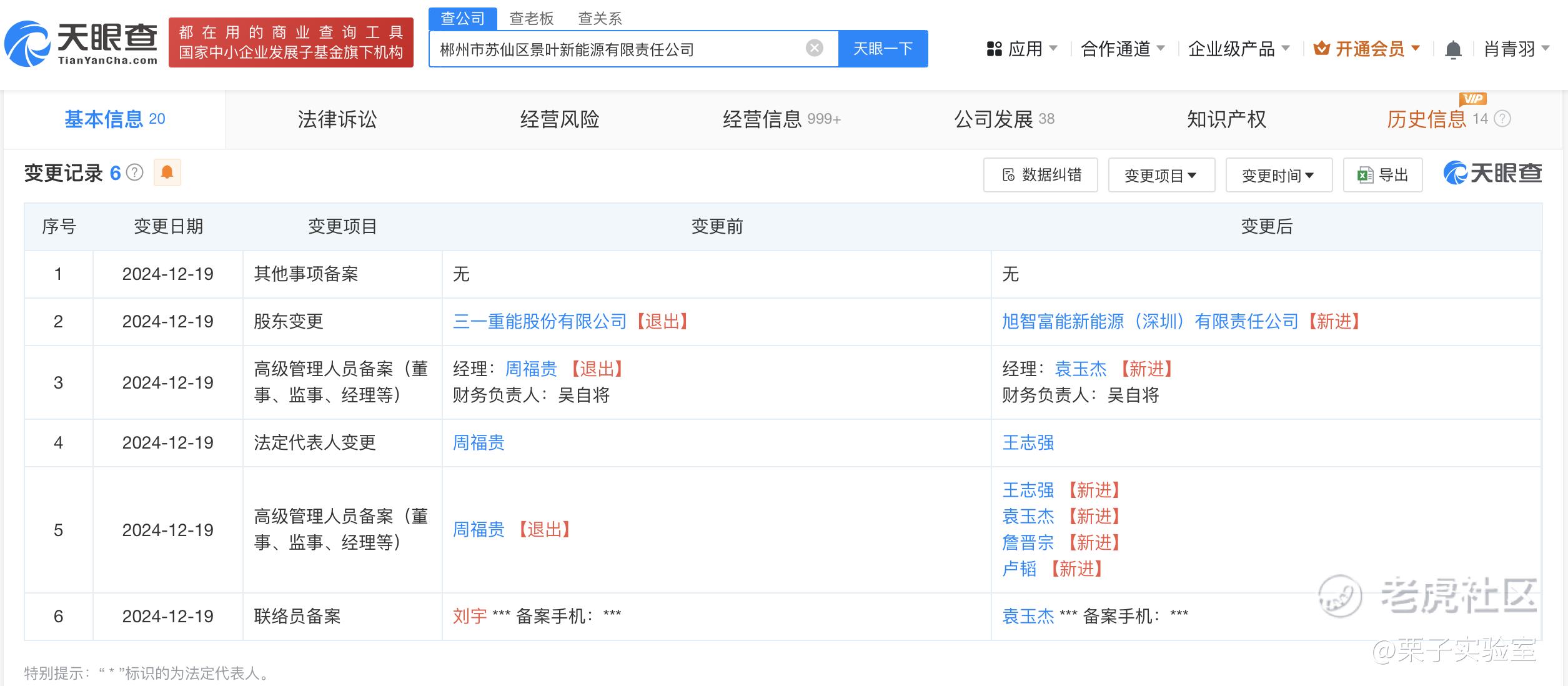 天眼查App显示,近日,郴州市苏仙区景叶新能源有限责任公司发生工商变更,原全资股东三一重能(688349)退出,新增旭智富能新能源(深圳)有限责任公司为全资股东,后者由富士康旗下富泰华工业(深圳)有限公司、旭智资本旗下宜兴旭智投资咨询合伙企业(有限合伙)共同持股,同时,多位主要人员也发生变更。