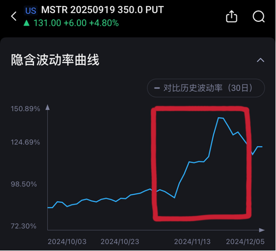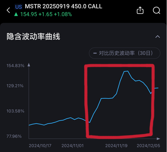 以下图Microstrategy 2025年9月19日的350C-450P宽跨式为例,其隐含波动率在11月初正股上行的时候也在随之飞速增长,但是当趋势在11月21日左右开始逆转之后,隐含波动率迅速从145%附近回落到了130%。