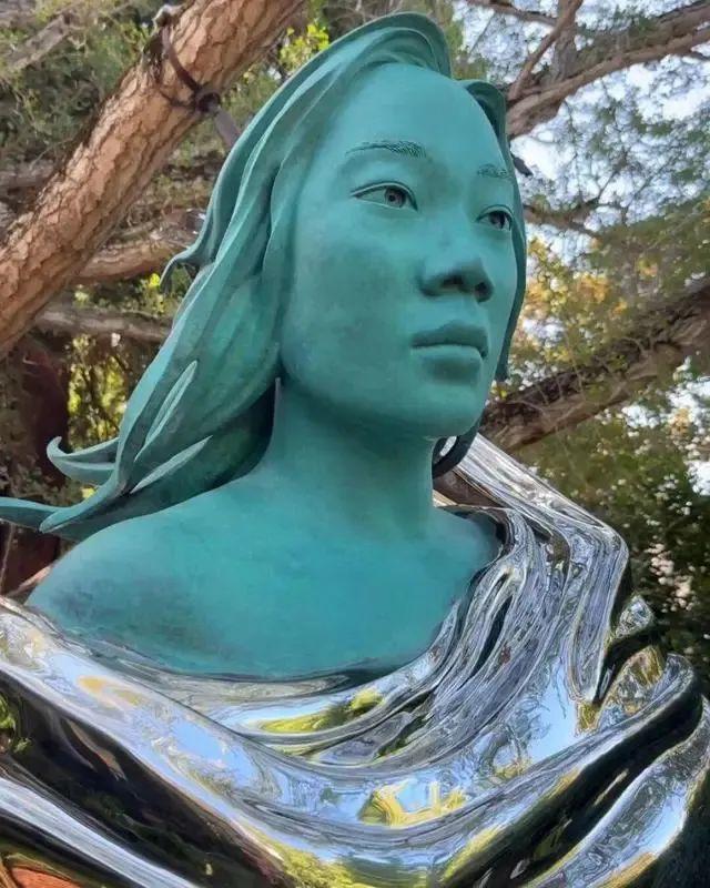 这座雕像是由美国艺术家阿沙姆创作,以银色和蓝绿色为主色调,展现了陈穿着银色斗篷享受微风的姿态,斗篷的后半部分被制作成了翅膀的形状。