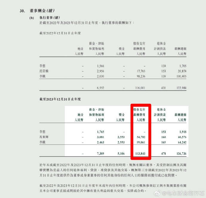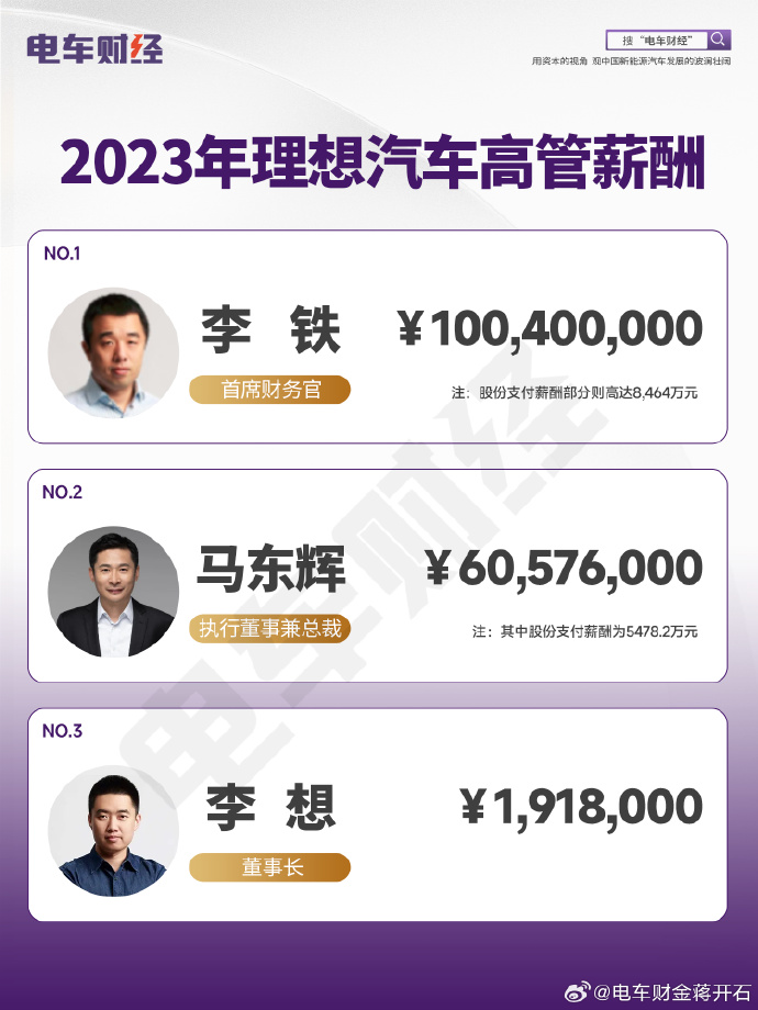 车企大多数都是有着股权激励的,所以在2023年李铁和马冬辉的薪酬显得很高。