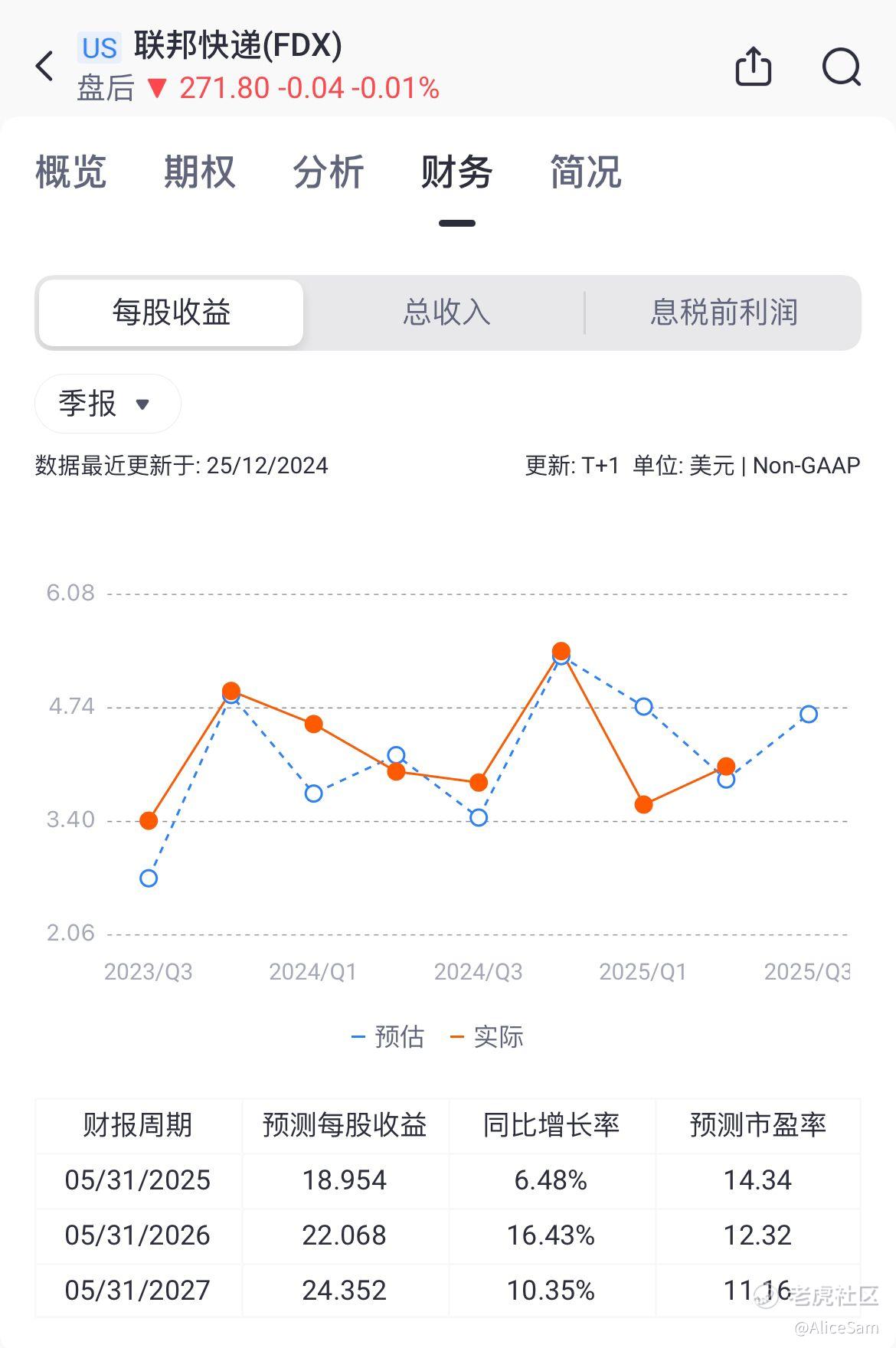 其次看他们的每股收益(EPS)情况,这个季度 FedEx稀释后 GAAP EPS 为 3.03 美元,non-GAAP EPS 为 4.05 美元。上一财年同期稀释后 GAAP EPS 为 3.55 美元,non-GAAP EPS 为 3.99 美元。业务优化成本在 2025 财年和 2024 财年对每股收益产生了一定影响,2025 财年为 1.02 美元/稀释股,2024 财年为 0.44 美元/稀释股。