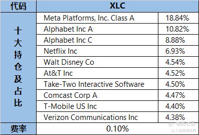 XLC全称是通讯服务行业精选指数ETF,重点投资美国大型通信服务公司,前十大重仓股包括Meta、谷歌母公司Alphabet的A股和C股、奈飞、迪士尼、AT&T等。