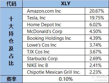 XLY是非必需消费品精选行业ETF,主要包括对经济周期敏感度较高的消费品类,如汽车、家庭耐用消费品、休闲设备等,前十大持仓包括亚马逊、特斯拉、HomeDepot、麦当劳、耐克、星巴克等,可以看出来XLY兼具消费属性与科技属性。