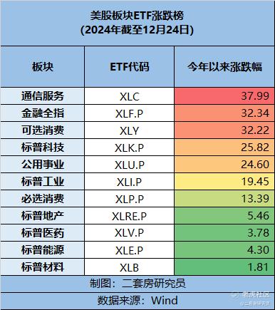 截至12月24日,标普500年内累涨27.35%,纳指累涨38.70%,道指累涨14.80%。从宽指来看,科技依旧领跑,但美股行业细分板块里的风格拉锯战还在继续,纵观2024全年,哪些板块是赢家?哪些板块跑输了?