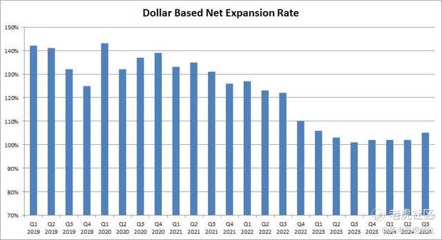当我们查看客户数据时,第三季度的百分比增长率确实是多年来最低的。然而,14,000个账户的同比增长实际上是连续增加了2,000个账户,这可能标志着该指标的底部。如下图所示,以美元为基础的净扩张率已经开始趋于上升,这应该是未来营收增长的好兆头。几个季度前,这是一个令人担忧的数字,当时该指标似乎会降至100%以下,预示着未来可能出现收入损失。