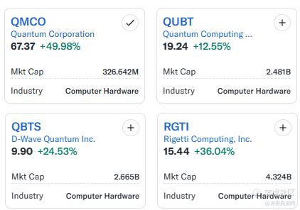 今天排在第一的依旧是量子计算机板块$昆腾(QMCO)$ 狂飙近50%。$Rigetti Computing(RGTI)$ 大涨超36%,$D-Wave Systems Inc.(QBTS)$ 大涨超24%,QUBT涨12.55%。